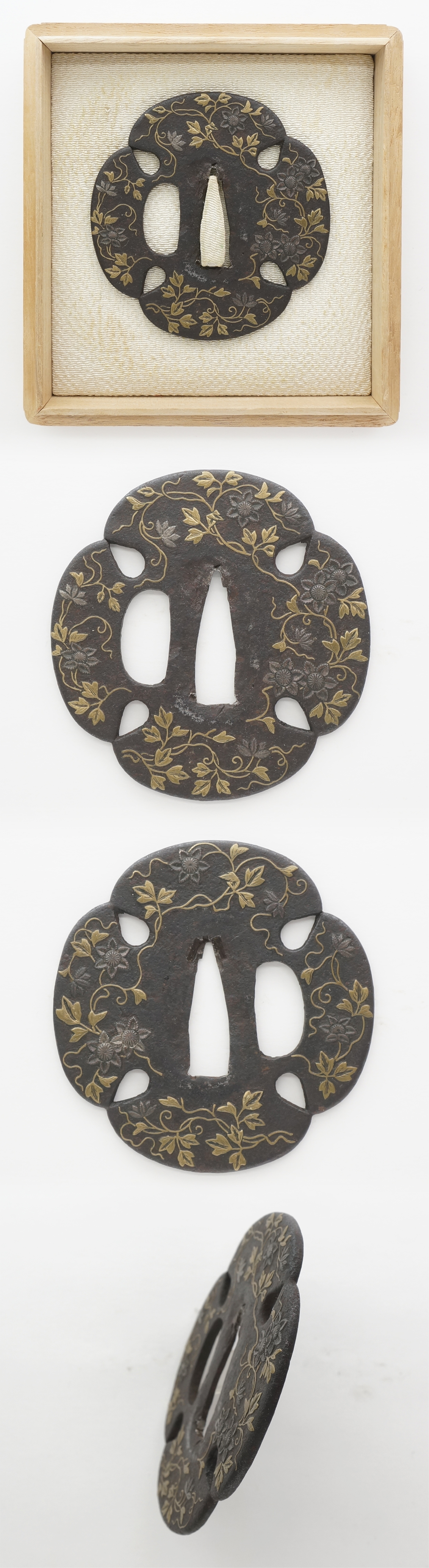 Ordering number : F10041 Tsuba: Mei (signature) : Mogarashi Nyudo Soten sei Length : 8.19 cm x 7.81 cm ( 32.2 inches x 3.07 inches) Thickness of rim: 0.47 cm ( 0.18 inches) Jidai(era) : Edo period. Special feature: On ...