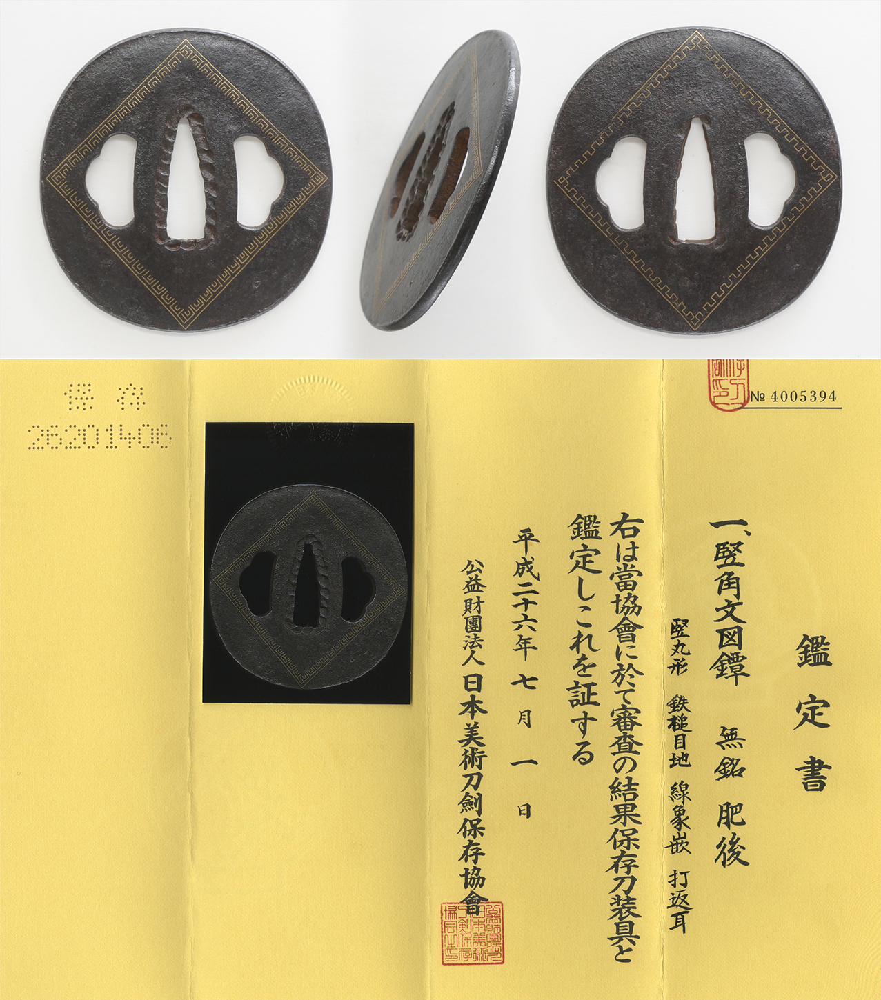 Tsuba : Mei (signature) : Mumei (unsigned) Length : 7.96 cm x 7.79 cm ( 3.13 inches x 3.07 inches) Thickness of rim : 0.60 cm ( 0.24 inches) Jidai(era) : Edo period Weight : 146 grams. Special feature : ...