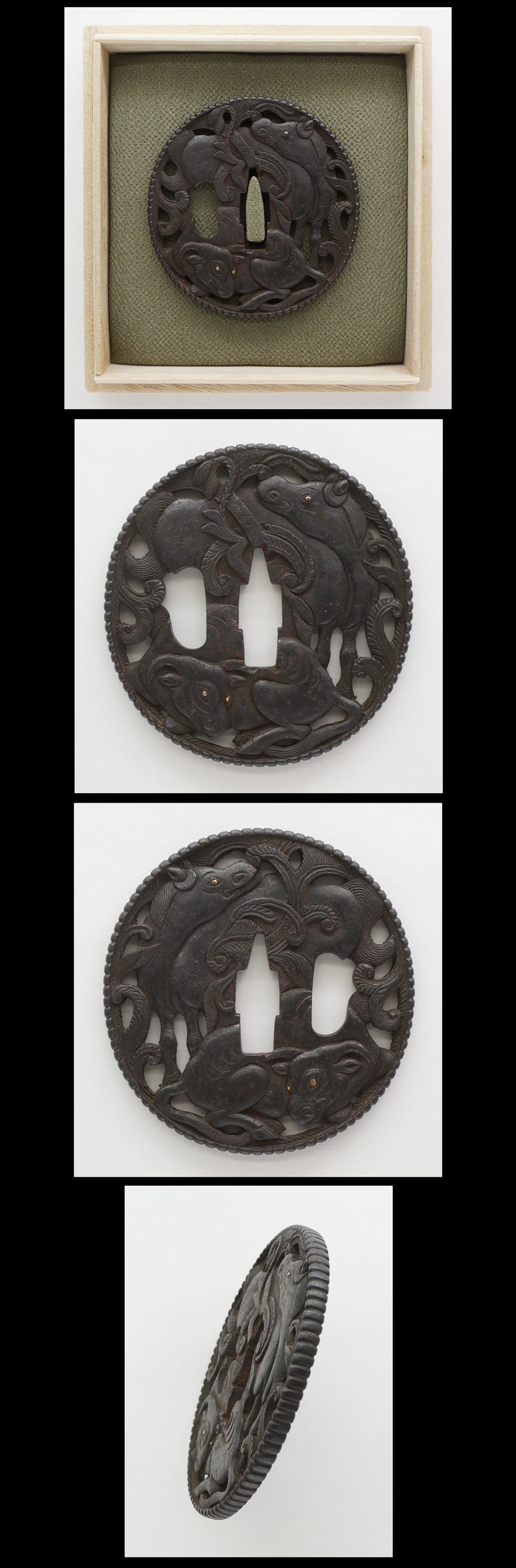 Ordering number : F16034 Tsuba: Mei (signature) : Mumei(Unsigned) Length : 7.25 cm x 6.83 cm ( 2.85 inches x 2.68 inches) Thickness of rim : 0.51 cm ( 0.20 inches) Weight : 152g Jidai(era) : Edo period Special feature ...