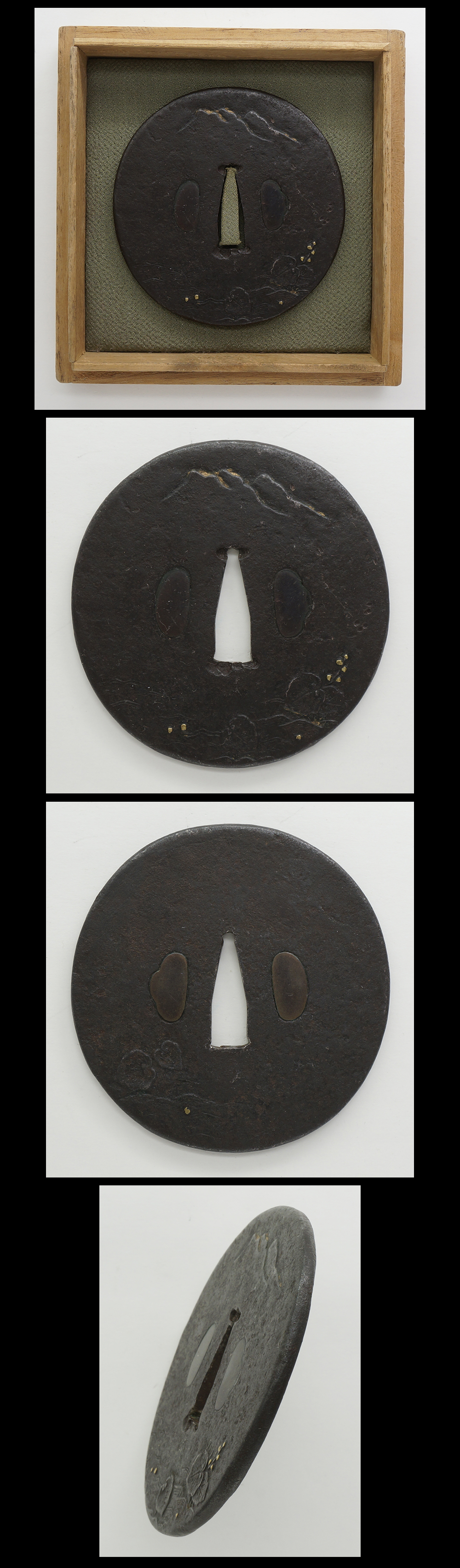 Special feature:On iron plate, landscape design is engraved and inlayed with gold. It is simple and nice condition tsuba.