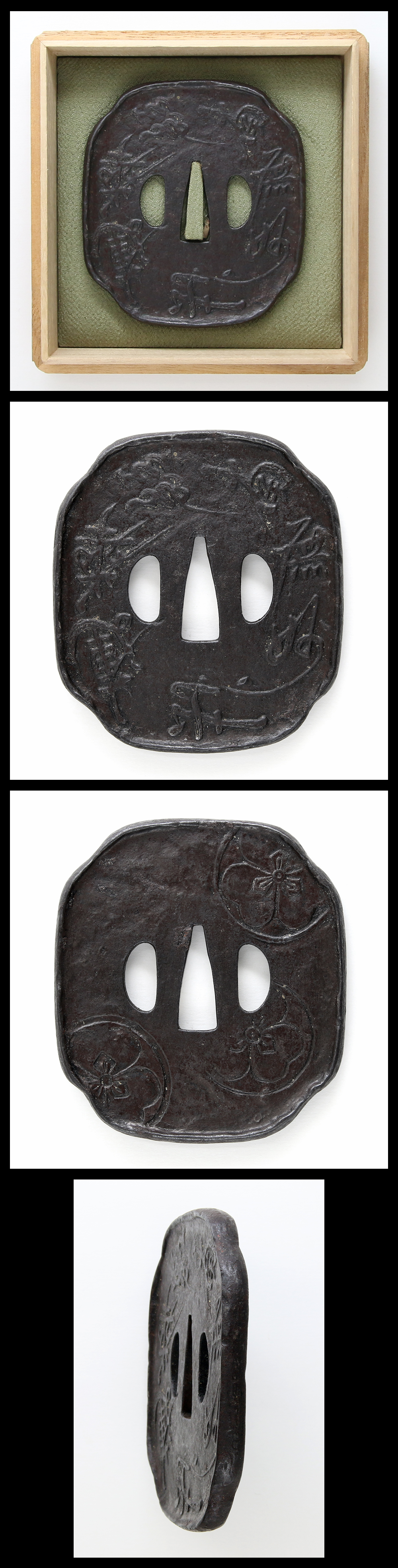 Special feature:On mokko shape iron tsuba seven letters “Namu Myo Houren Gekyo” is engraved. It is theme to become a devote beliver in Buddhism. It is rare design tsuba.