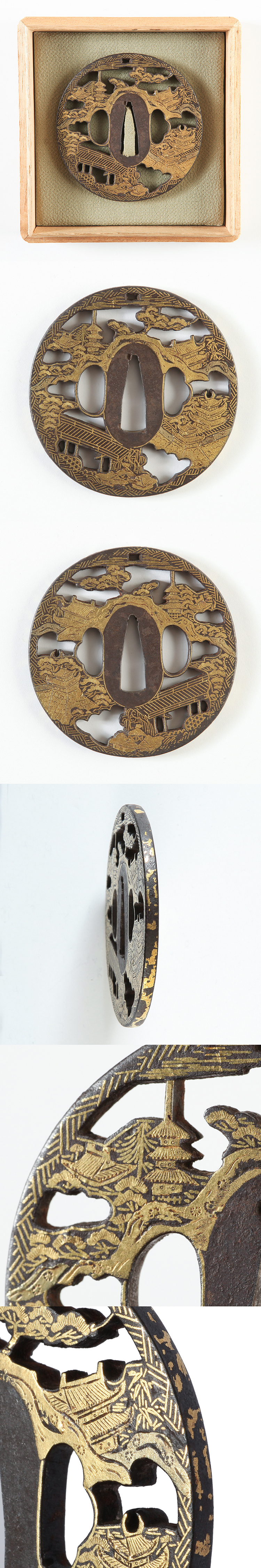 Special feature:Round shape iron tsuba with Rakuchu Raikugai(views in and around the city of Kyoto) put by cloth inlay. Because they have put fine line It is known as Kenjyo Tsuba.