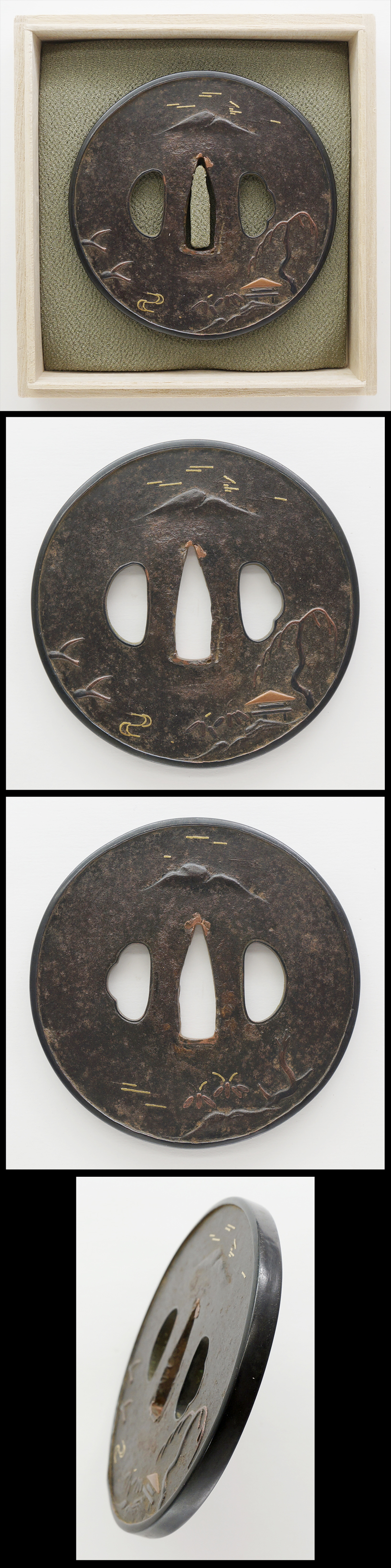 Special feature: On round shape iron tsuba, scenery design is engraved and inlaid with gold, copper and Shakudo. The rim is Shakudo plate.