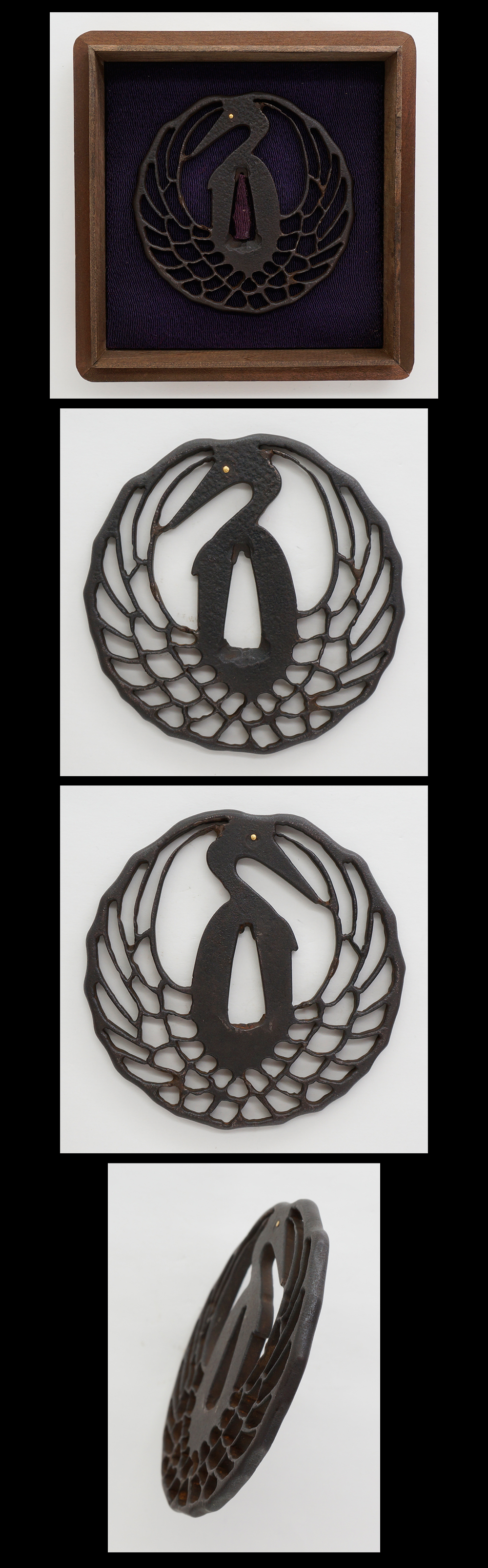 Special feature:On unique shape iron tsuba, Tsurumaru openwork design is engraved. The fine sukashi open work is wonderful.