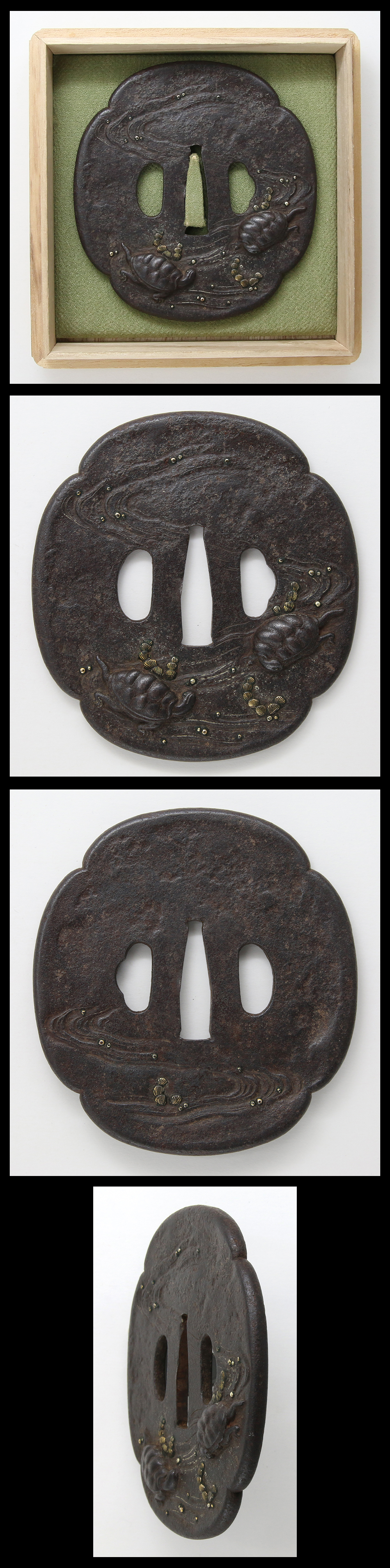 Special feature:On mokko shape iron tsuba, turtle and water plant design is engraved and inlayed with gold. The flow of the water is expressed in an elegant matter.