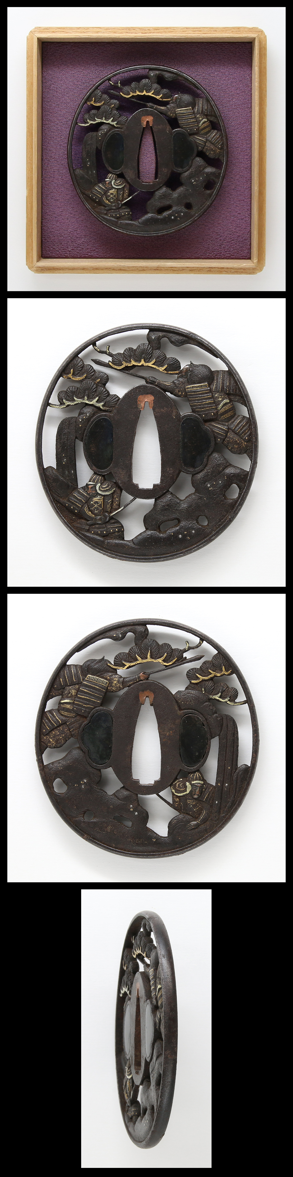 Special feature:On round shape iron tsuba, warrior and pine design is engraved and inlayed with gold, silver and bronze.
