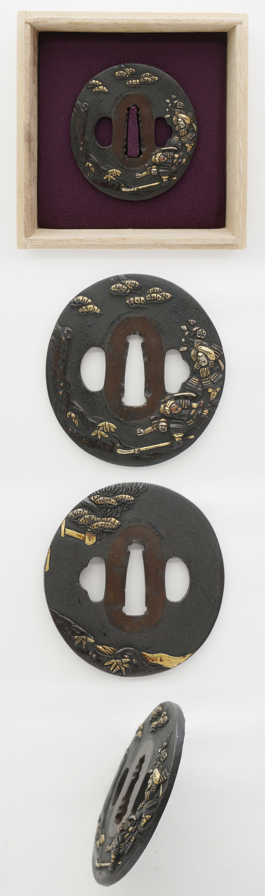 Special feature: Tatemaru shape shakudo nanakoji tsuba with bushi(warrior) design engraved and inlaid with gold and silver.