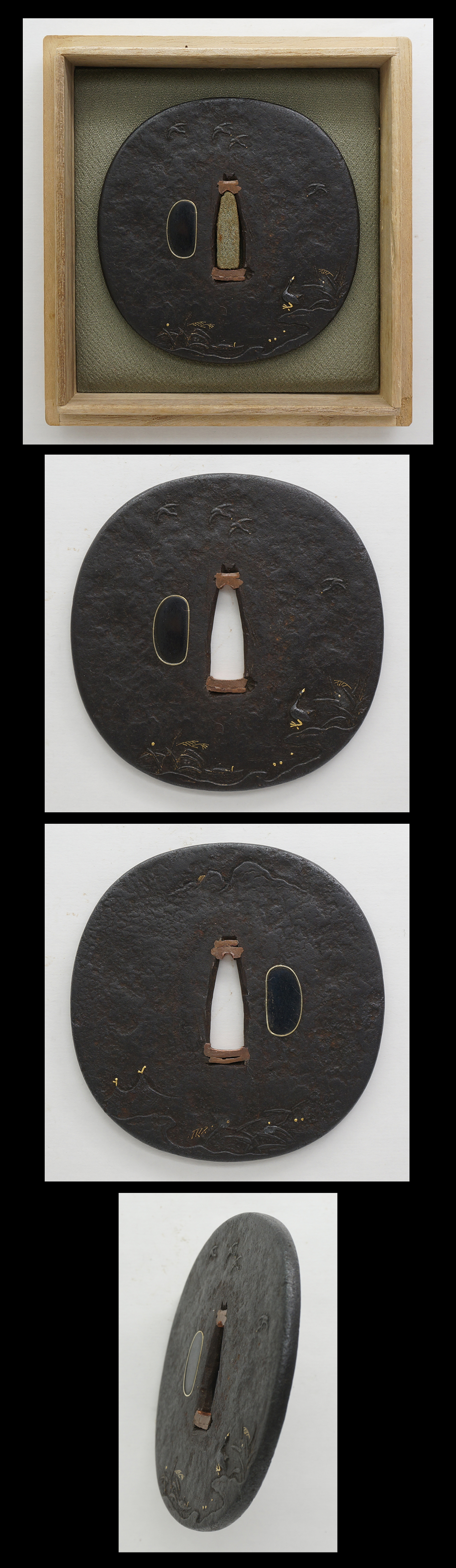Special feature:Round edge square tsuchime-ji tsuba with water birds and the water’s edge is engraved and inalyed with gold. It is simple tsuba yet elegant.