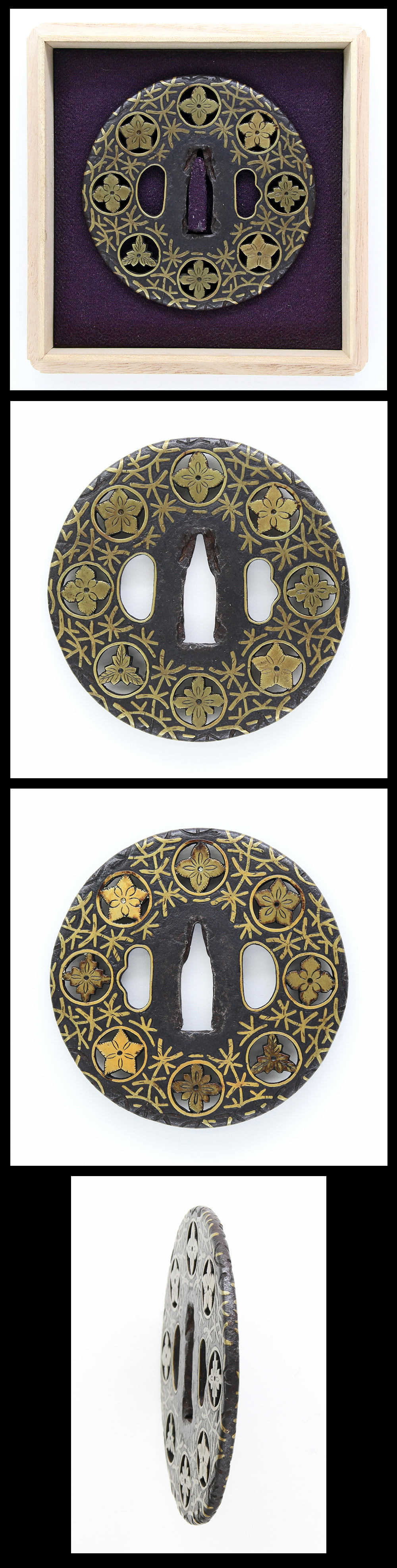 Special feature: On the round iron Tsuba, 8 family crests are engraved in openwork with brass is inlaid.
