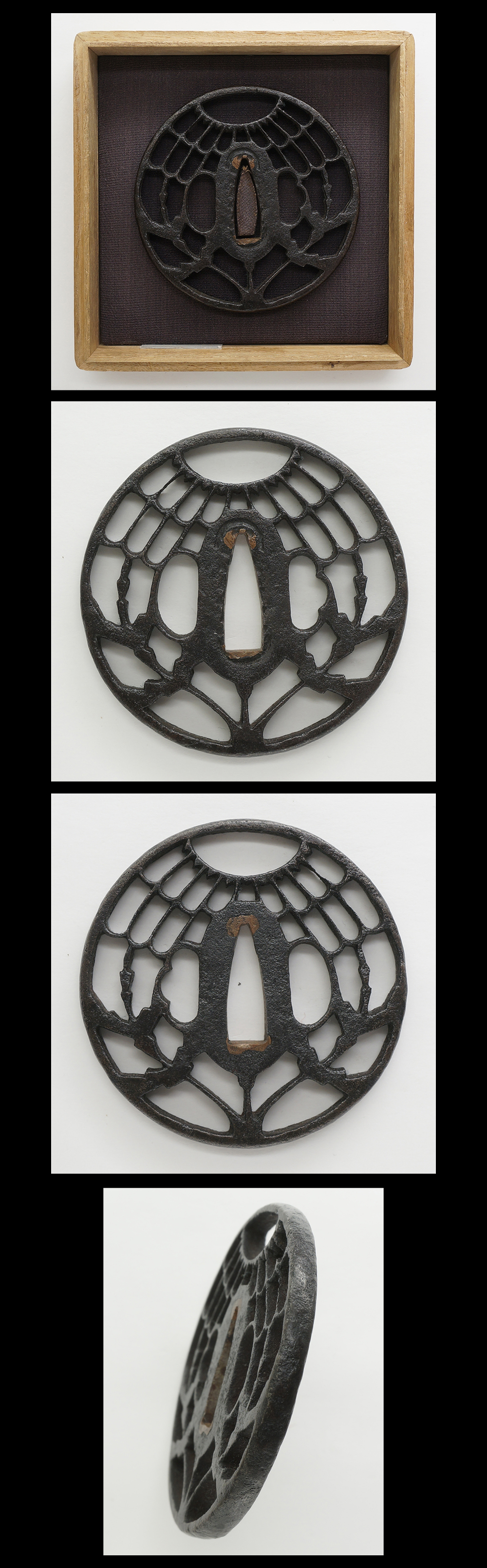 Special feature:On round shape iron tsuba, chrysanthemum and branch design is engraved in open work. The tsuchimeji texture on the surface is beautiful.
