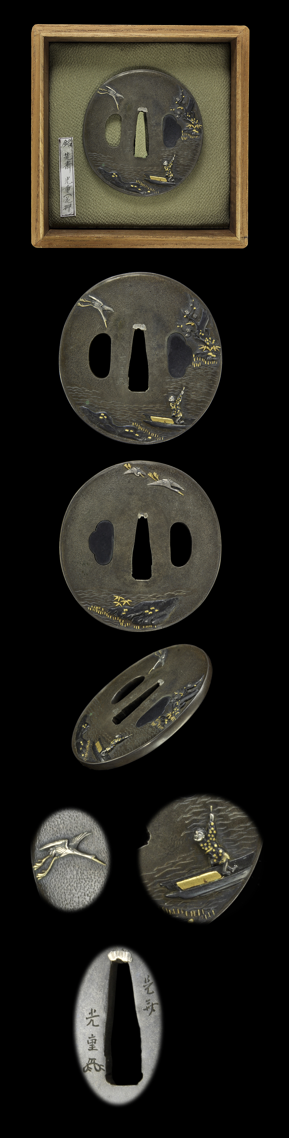 Special feature: Goto Mitsushige was born in Keicho 5(1600). He is son of Goto Eijo. The round shape Shibuichi Tsuba, the landscape is engraved with gold and silver color. There are Rinpo(he is a Chinese poet) , Japanese plum tree and crane. Rinpo said that his wife is Japanese plum tree, his son is crane. We recommend this Tsuba very much.