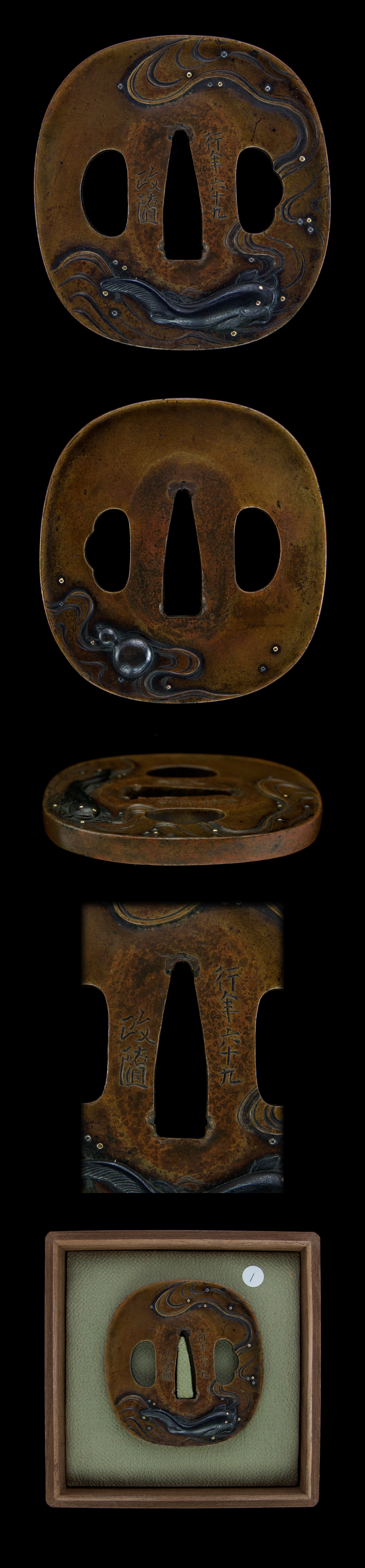 Special feature: Shozui was born in 1696. He was a student of Toshinori Nara. This Tsuba was made at the age of 69. On the copper Tsuba, catfish and calabash are engraved with gold color.