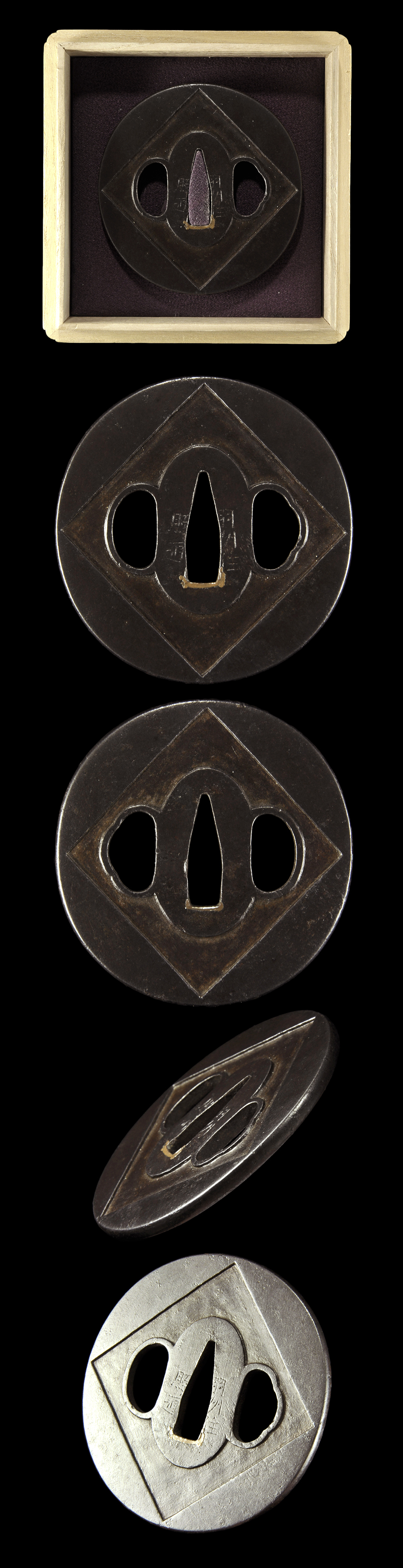 Tsuba: Mei (signature) : Eshu Hikone Ju Mogarashi Nyudo Soten sei Length : 8.40 cm x 7.92 cm ( 3.30 inches x 3.11 inches) Thickness of rim: 0.47 cm ( 0.18 inches) Jidai(era) : Edo period. Weight:152 grams. Special feature: Round shape ...