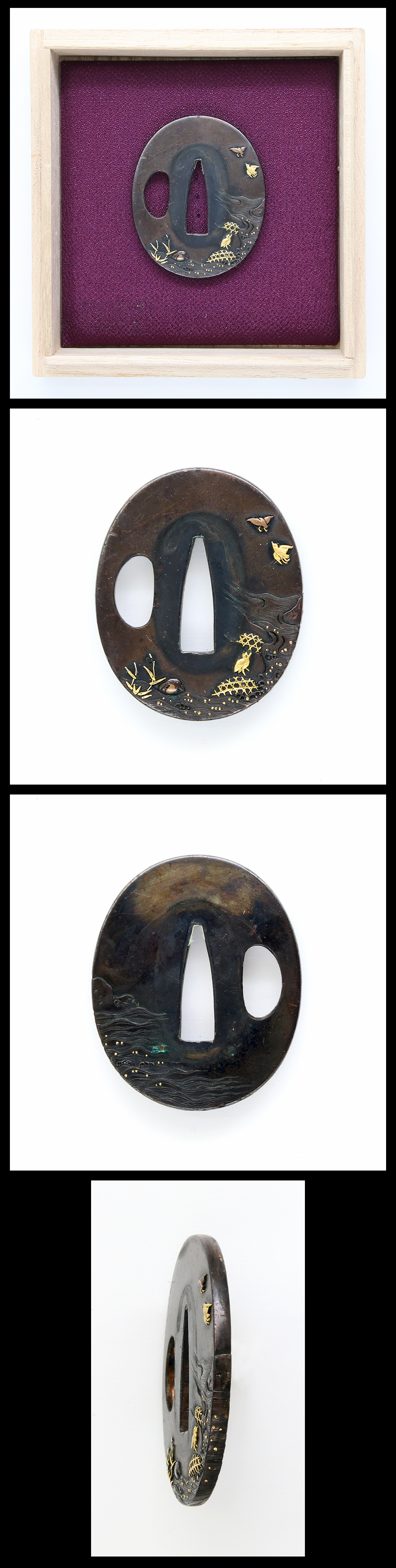 Special feature:On reddish shakudo tsuba, vird and flow of the river is engraved and inlaid with gold in elegant manner. It is small size 5.58cm tsuba yet the river surface with reflection of the sun is expressed beautifully