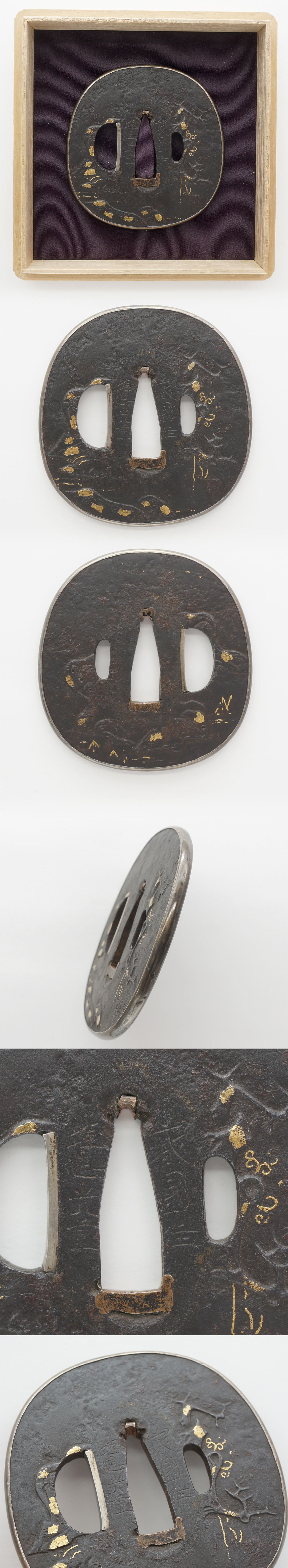 Special feature:Aoi(saddle) shape corroded iron tsuba with old tree design engraved. The rim is silver. It is calm and fine style tsuba.