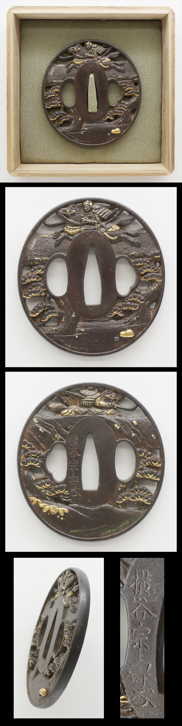 On this oval shape shiny iron tsuba, pine and horse widing warrior