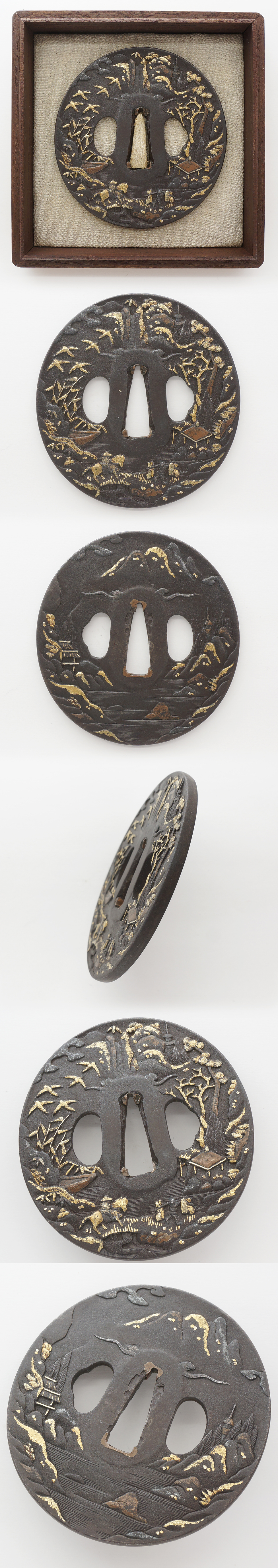 Special feature: Round shape iron Tsuba, landscape is engraved with gold cloth inlay.