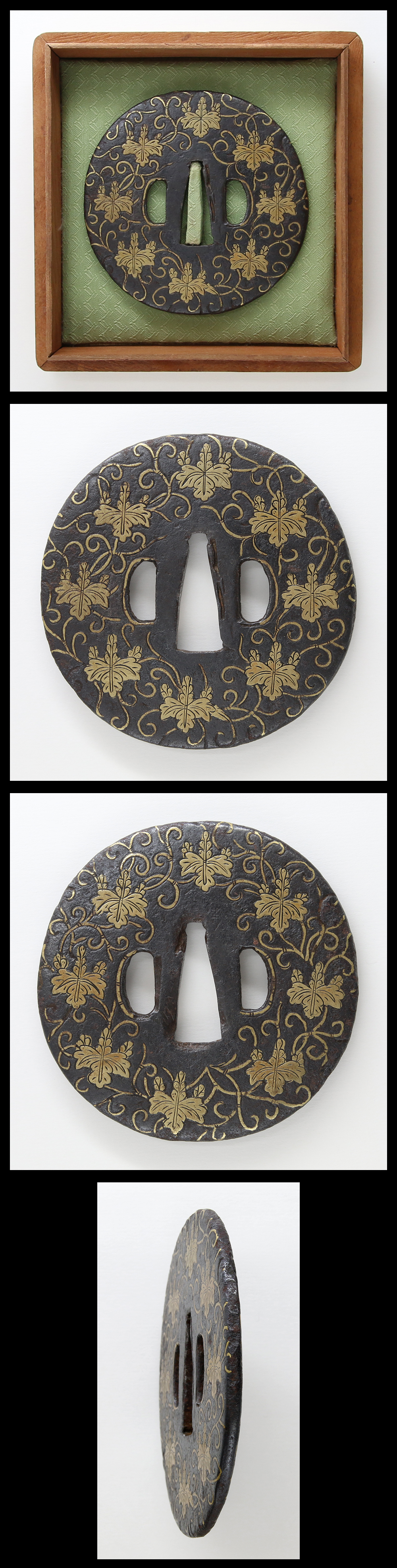 Special feature:Round shape iron tsuba with Fuji-mon and Karakusa pattern is inlayed in brass. It is typical Heian Jyo Zogan piece and it is nice tsuba to view.