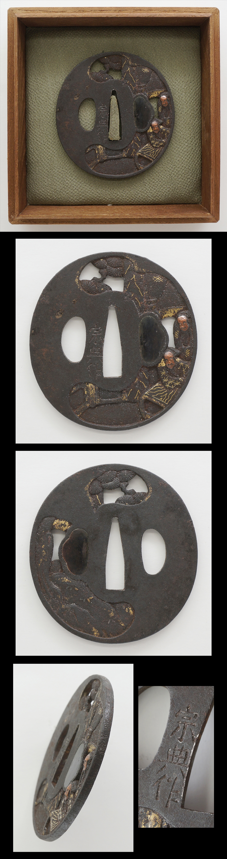 Tsuba: Mei (signature) : Mogarashi Nyudo Soten sei Length : 8.9cm x 7.82cm ( 3.5inches x 3.08inches) Thickness of rim: 0.43cm ( 0.17inches) Jidai(era) :Edo Period Special feature:On round iron tsuba, pine and warrior design is engraved and inlayed with ...