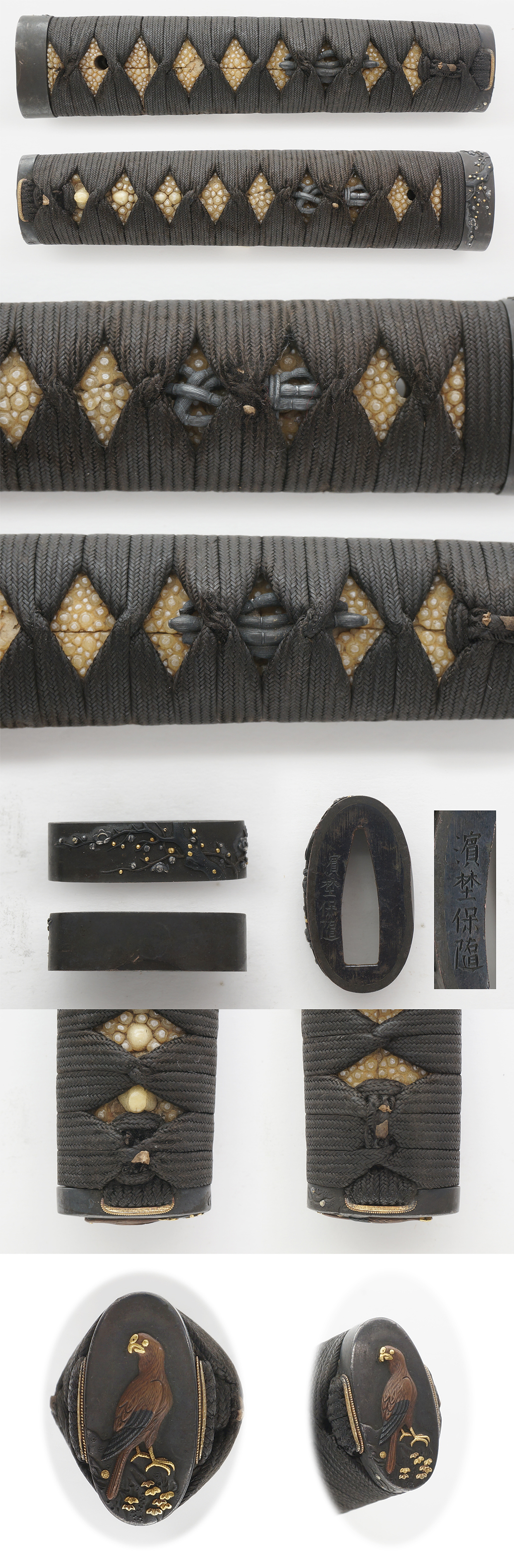 Kashira : Syakudo plate, the hawk is engraved and inlayed with copper and gold iroe.