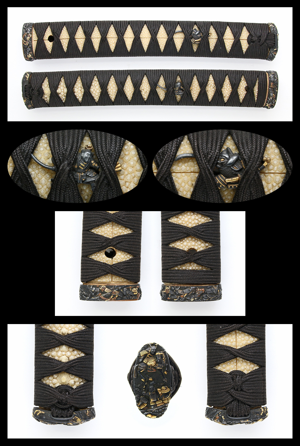 Menuki : Shakudo plate with warrior design engraved and inlaid with gold.