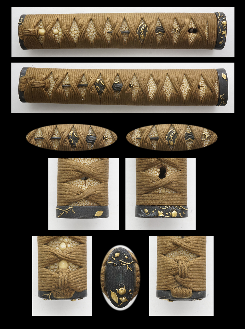 Fuchikashira: On granulated shakudou ground, nuts, falling leaves and a pot is engraved and inlayed with gold.