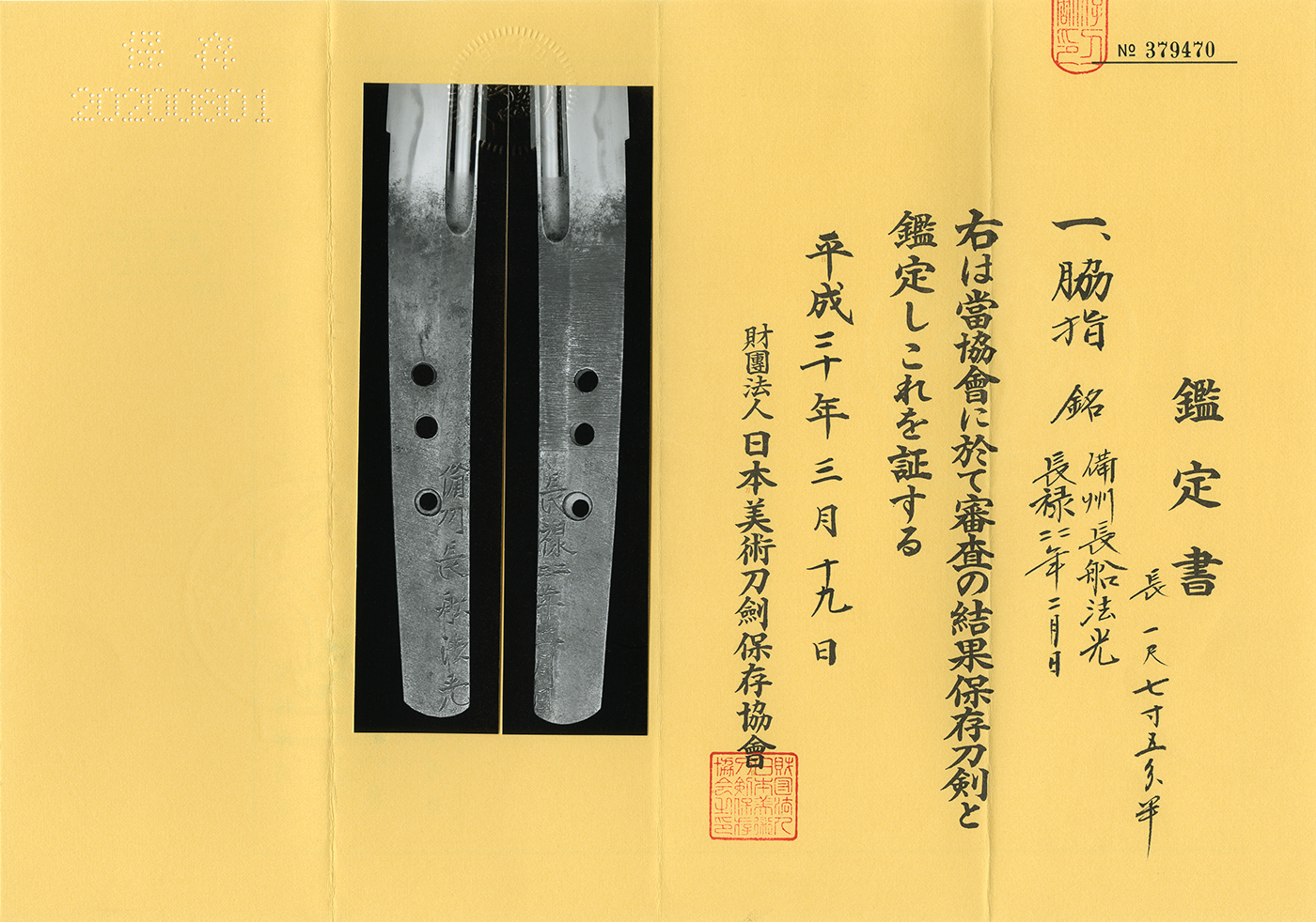This blade has tiny Kizu. But it is not serious. The "Choroku 4 nen 2 gatsu hi "is also precious.