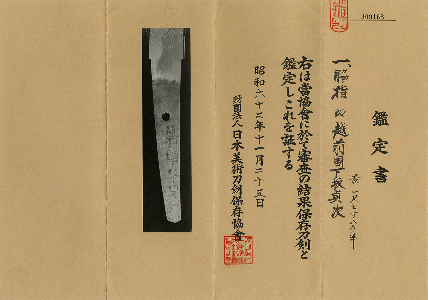 Jyo saku and regular saki)This Echizen Kuni Shimosaka Sadatsugu belongs to Jyo saku ranking.