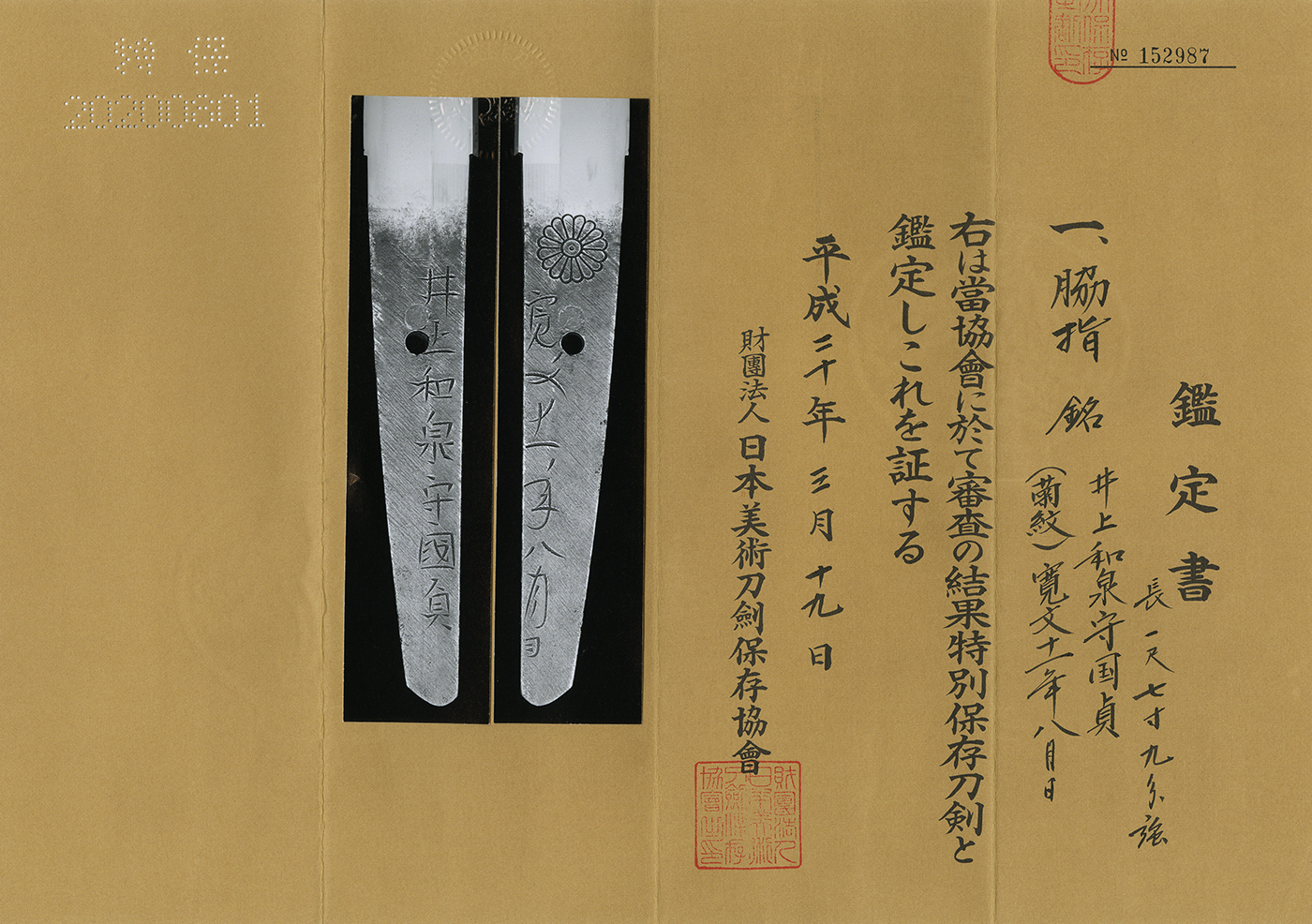 Wakizashi: Inoue Izumi Kami Kunisada (2nd generation)/ (Kiku mon) Kanbun 11 nen 8 gatsu Hi (August 1671)