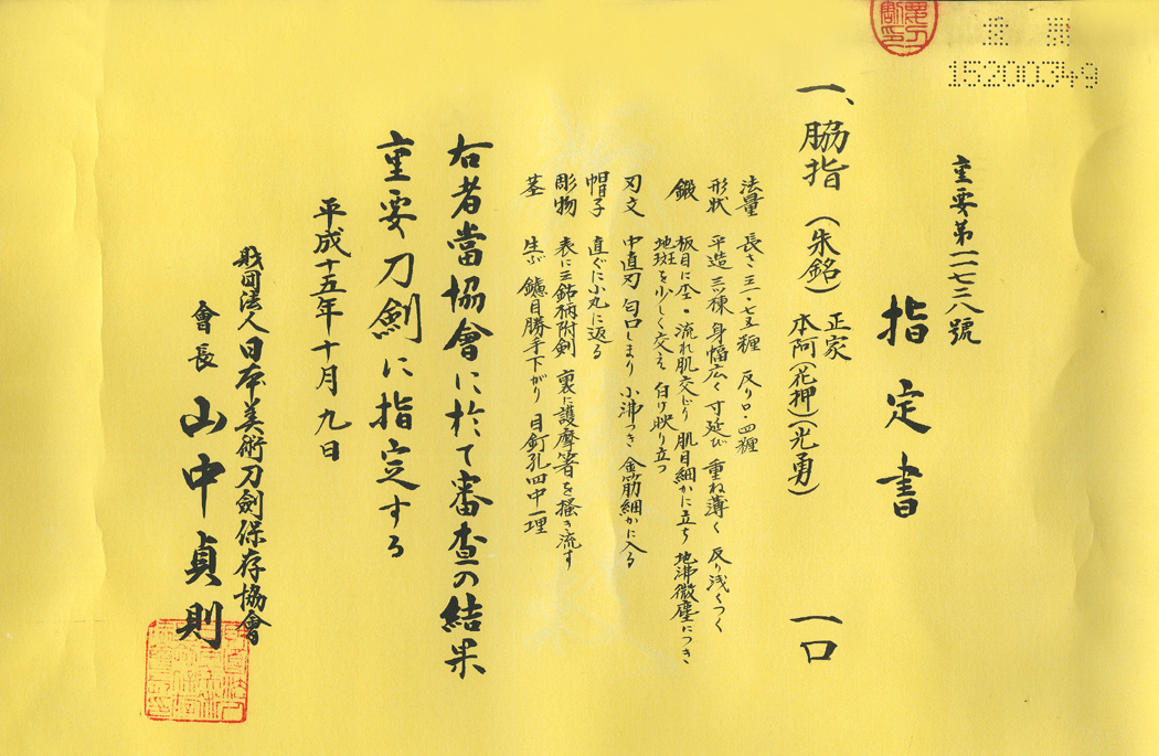 I think the blade was influenced from Aoe school much better than Yamato school. acceding to the Juyo zuhu, (juyo book), This blade is rather tight middle suguha hamon with konie and komaru boshi which is typical Komihara special feature. Honami Koyu's shumei (red color) is precious and tasteful jigane and Hamon also Horimono is well balanced.