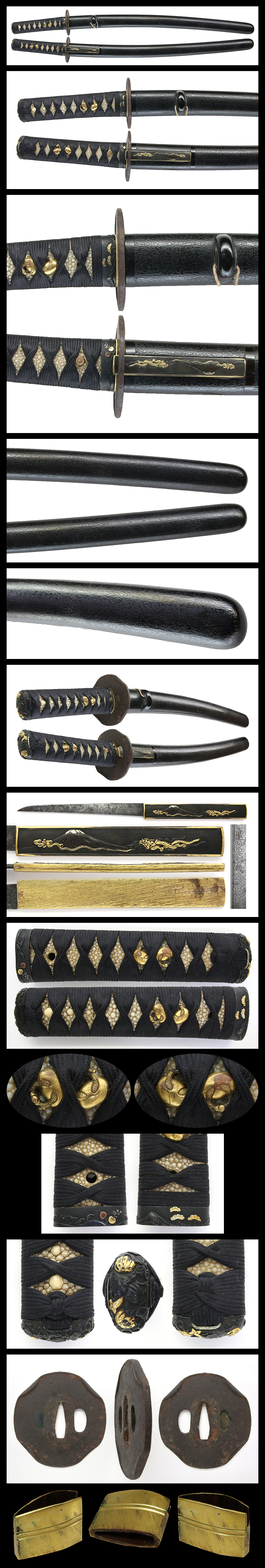 Fuchi : Pine tree, morning glory flower and wave of Suruga are engraved on Shakudo Nanakoji plate with gold color. Kashira : Japanese pumpkin engraved on Shakudo Nanakoji plate.