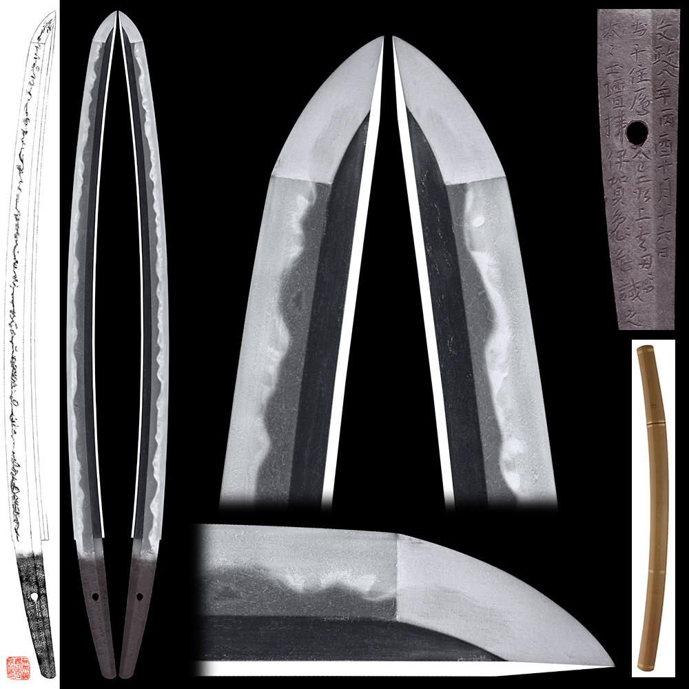 Shape : Keeping nearly original condition shape. Wide and thick blade having long Kissaki.