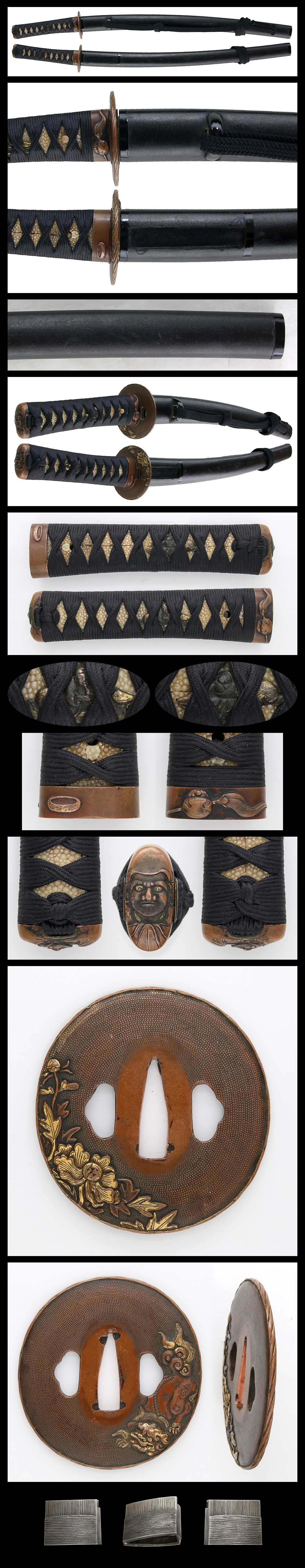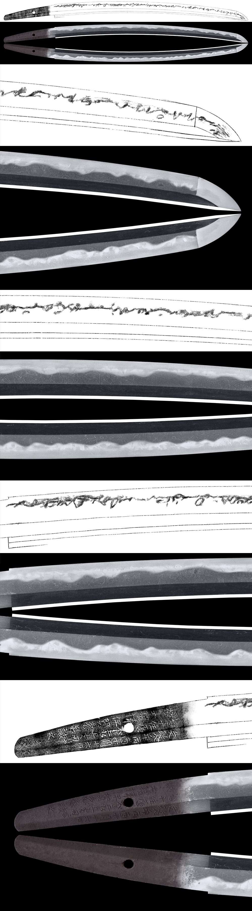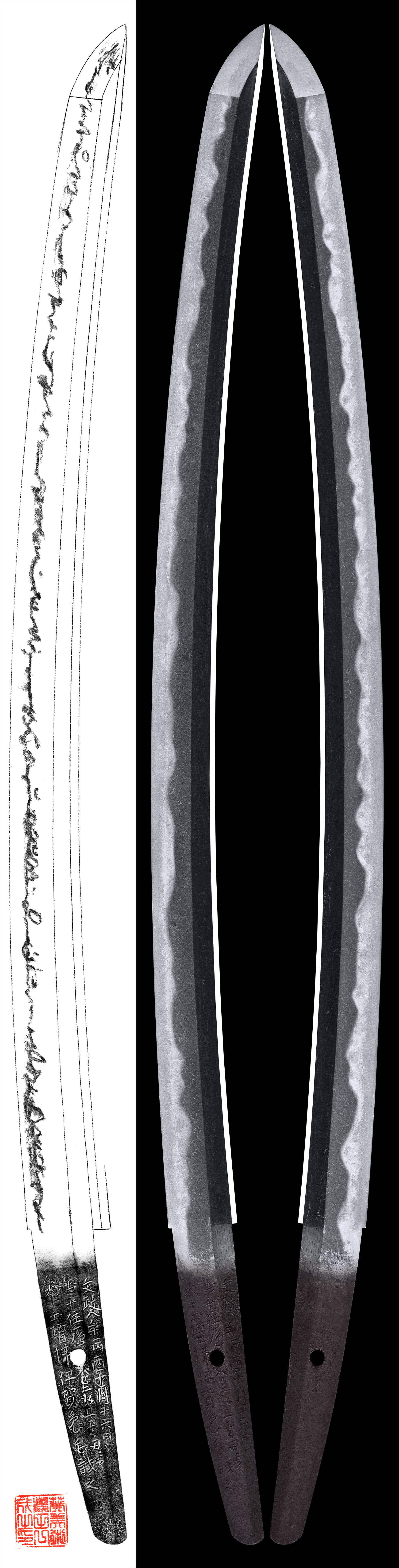 Hamon : Konie-deki Choji-Midare making a line Ashi, Yo, Sunagashi and Kinsuji work very active. Boshi turns Midarekomi style and become Kaen style near by the tip.