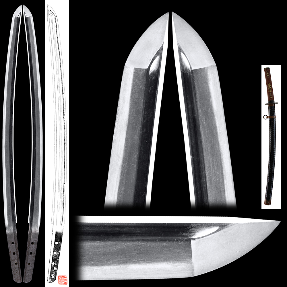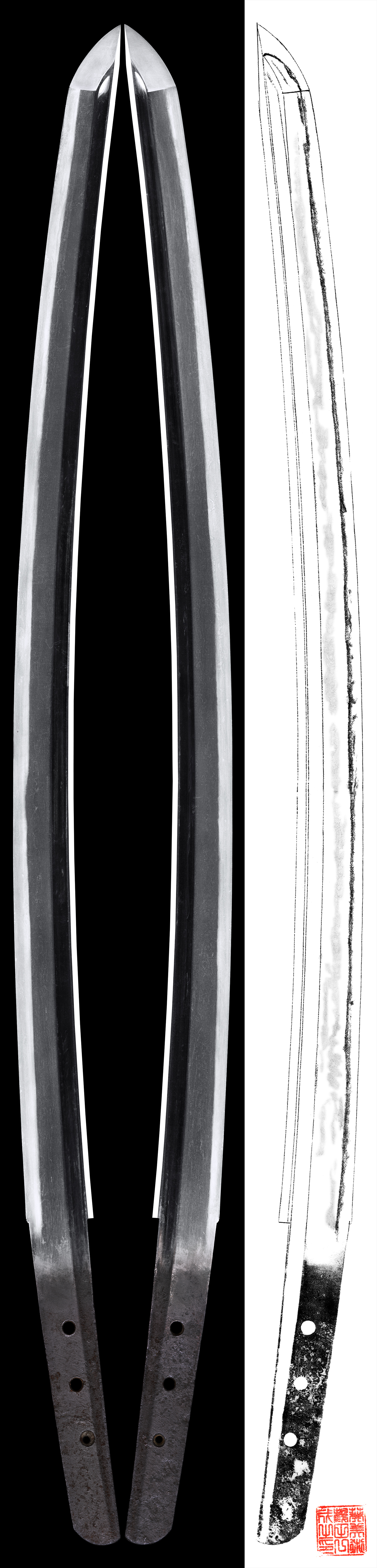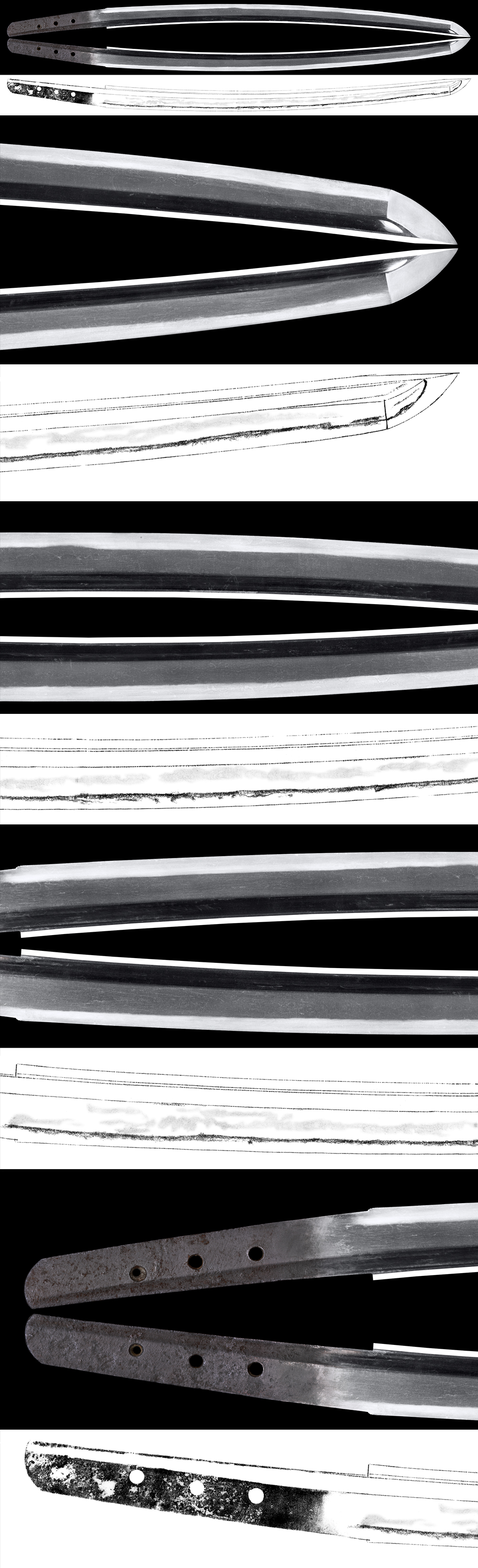 Shape : The blade is Osuriage mumei (cut shortened) and engraved Bo-hi on both sides of the blade.