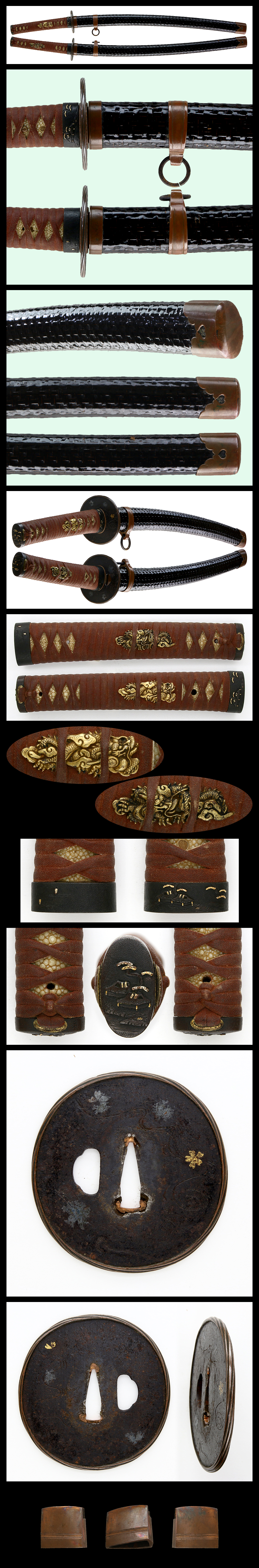 Tsuba : On the round shape iron Tsuba, the rim is covered by brass rope design.