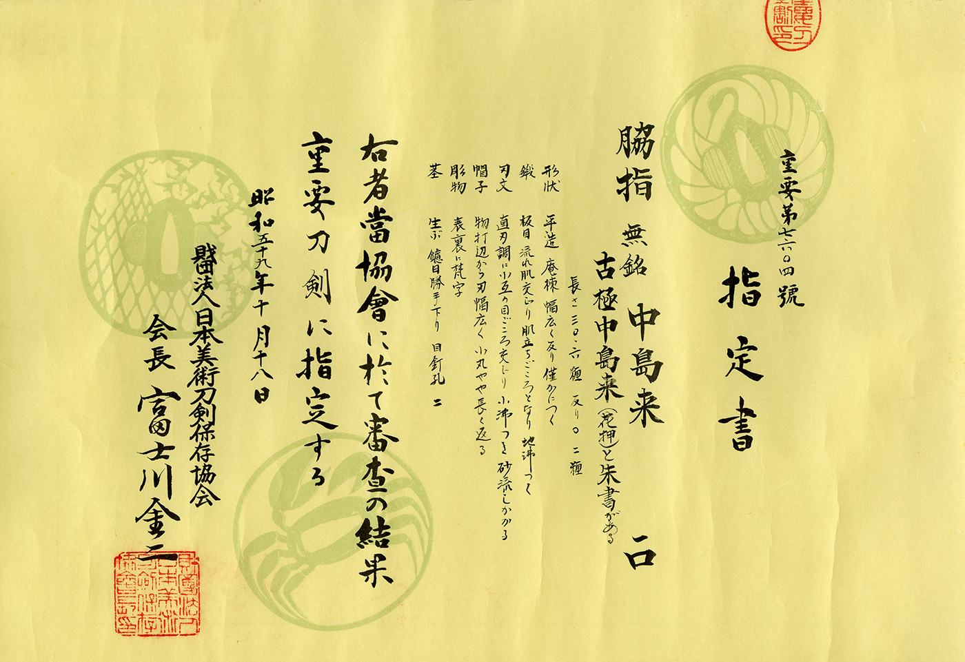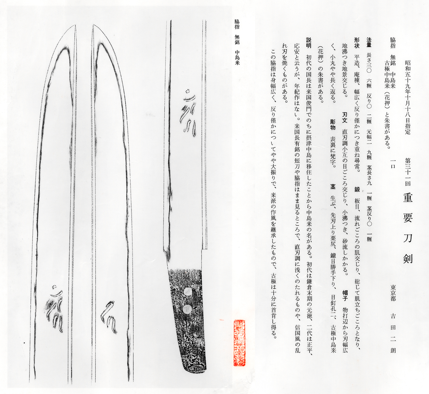 (Unsigned blade attribute as Nakajima Rai by Matsidaira Ukyo Dayu with Shumei, September 1929) *The writer of Sayagaki is unkown.