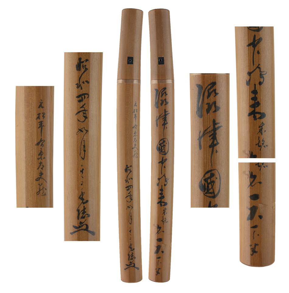 Shape : The blade is rather wide and thick Mitumune style Sunnobi Tanto. On both sides of the blade, ‘Bonji’the Siddham script mentioned as Acala and Daikokuten are engraved.