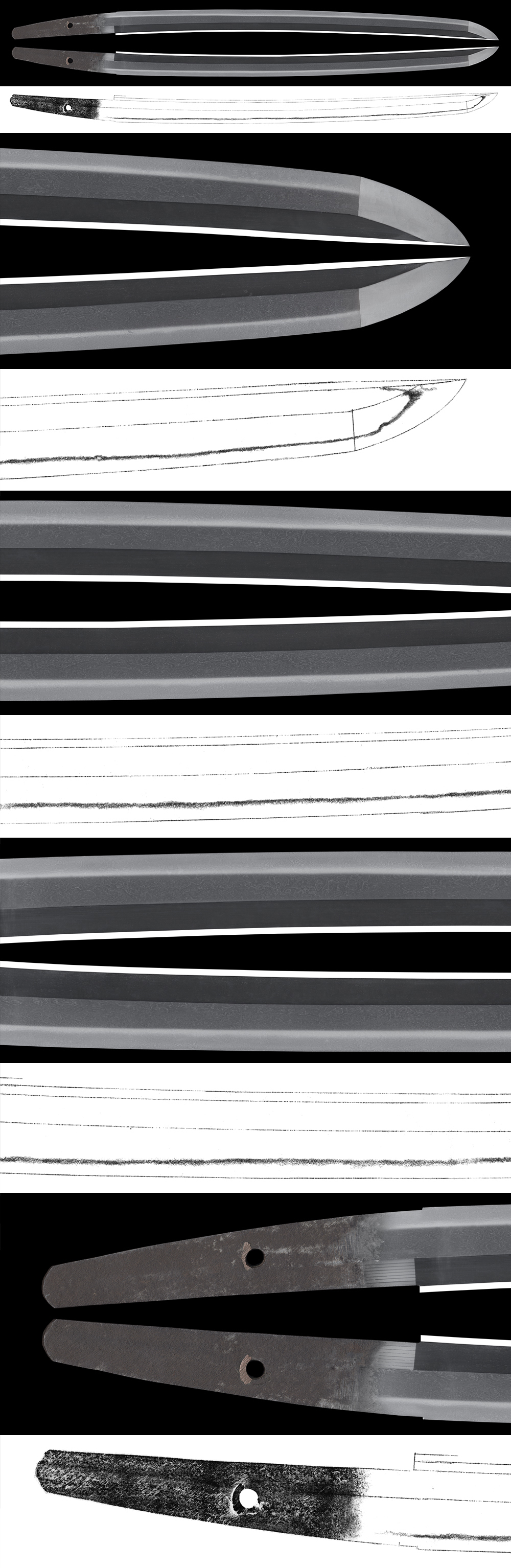 Hamon : Nie ground suguha with rather thick nioikchi.Boshi is brushing up style round shape.