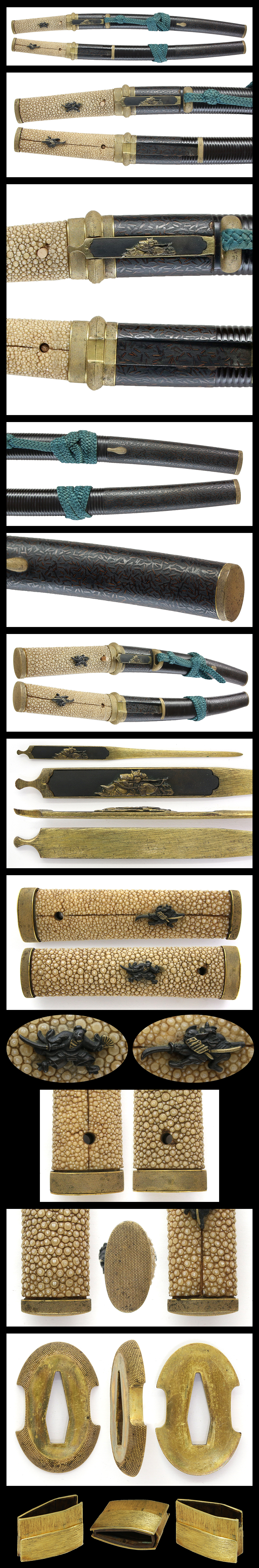 Koshirae : Fuchikashira, Kojiri, Kaerizuno and Kurigata are Shakudo-nanakoji plate with gold color.