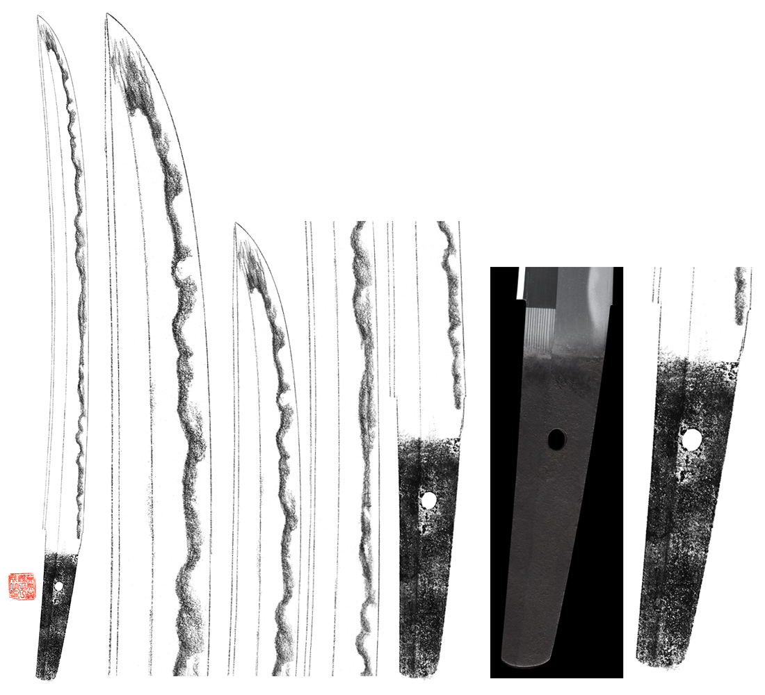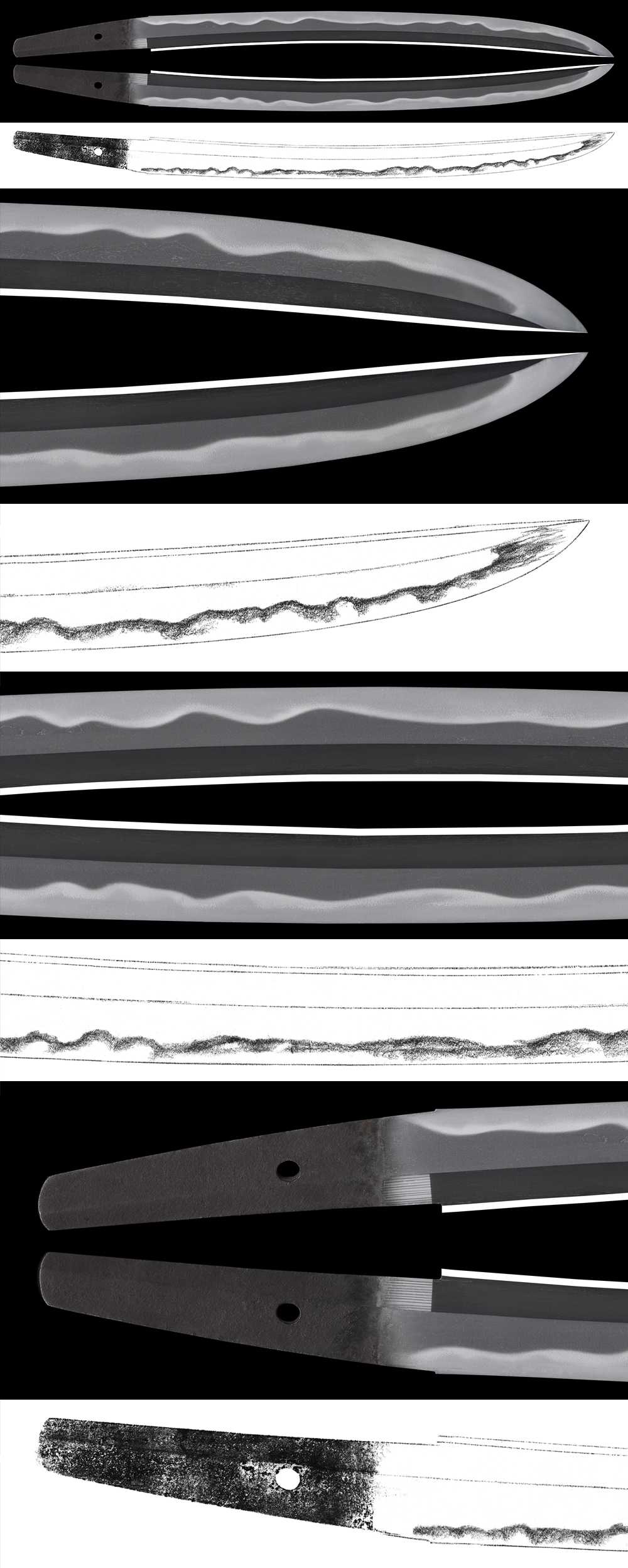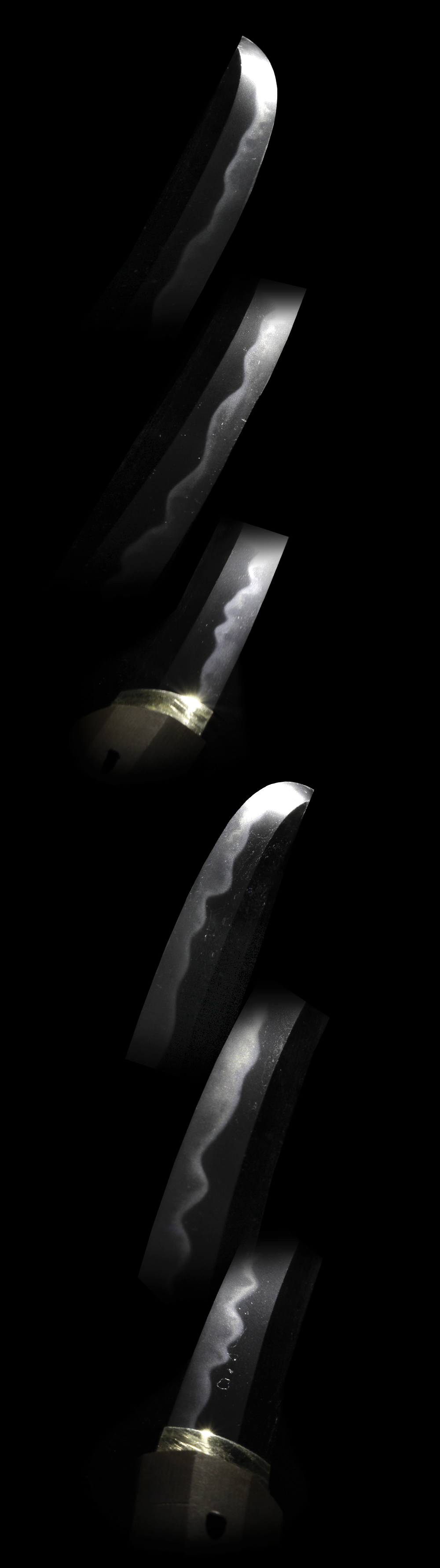 Hamon : Niedeki Oogunome midair with thick nioikuchi and in Ha, there are many sunagashi and also small kinsuji work.