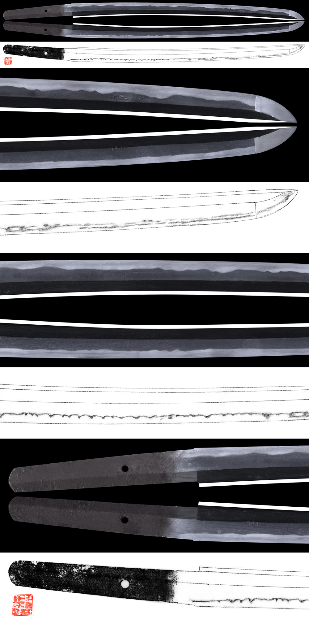 Hamon : Nie-deki Gonome-midare with Double Ha mixed, Boshi Hakikake style.