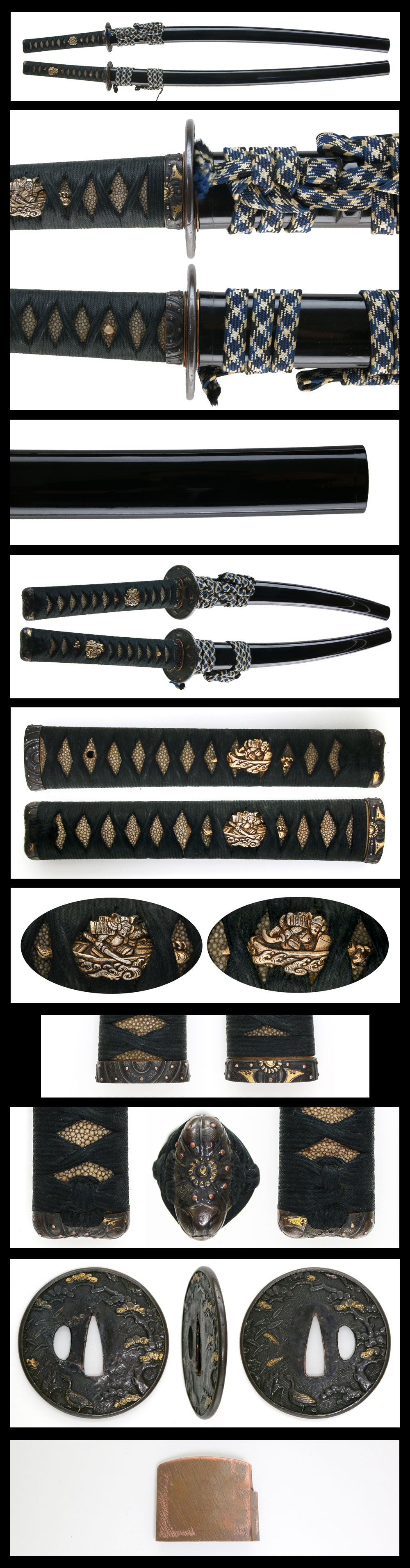Fuchi-kashira : Kabuto carved on Shakudo plate with gold plate.
