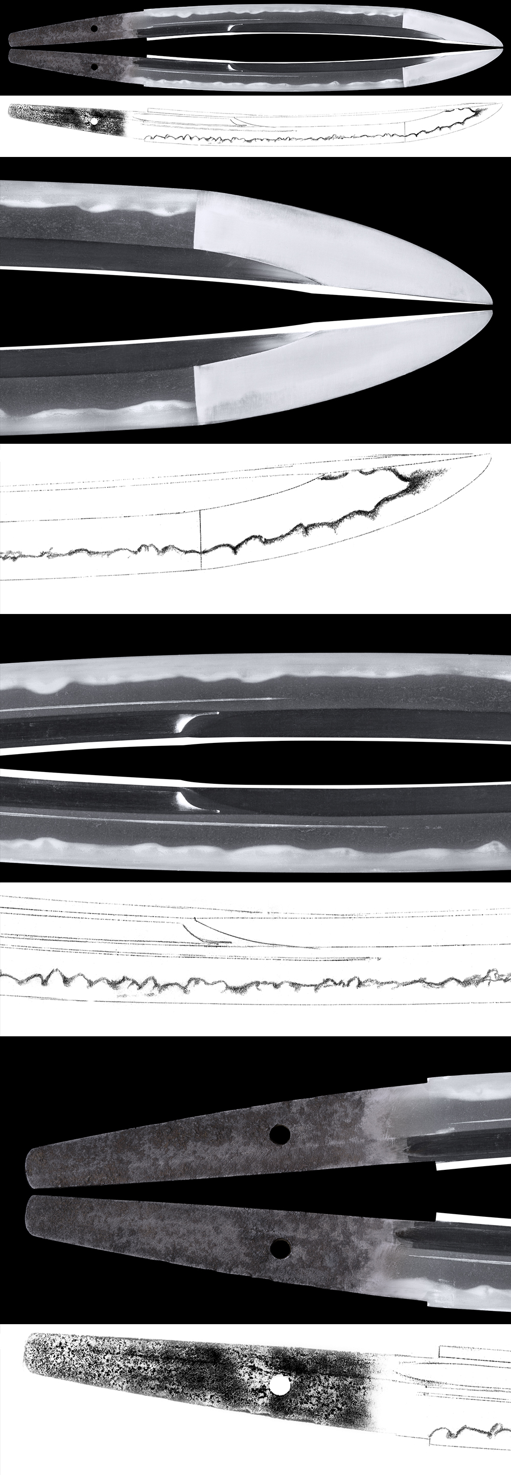 Shape : The blade is naginata naoshi(the blade was Naginata and later on, the naginata was changed to wakizashi) the blade is wide and thick woth long kissaki nice looking shape.
