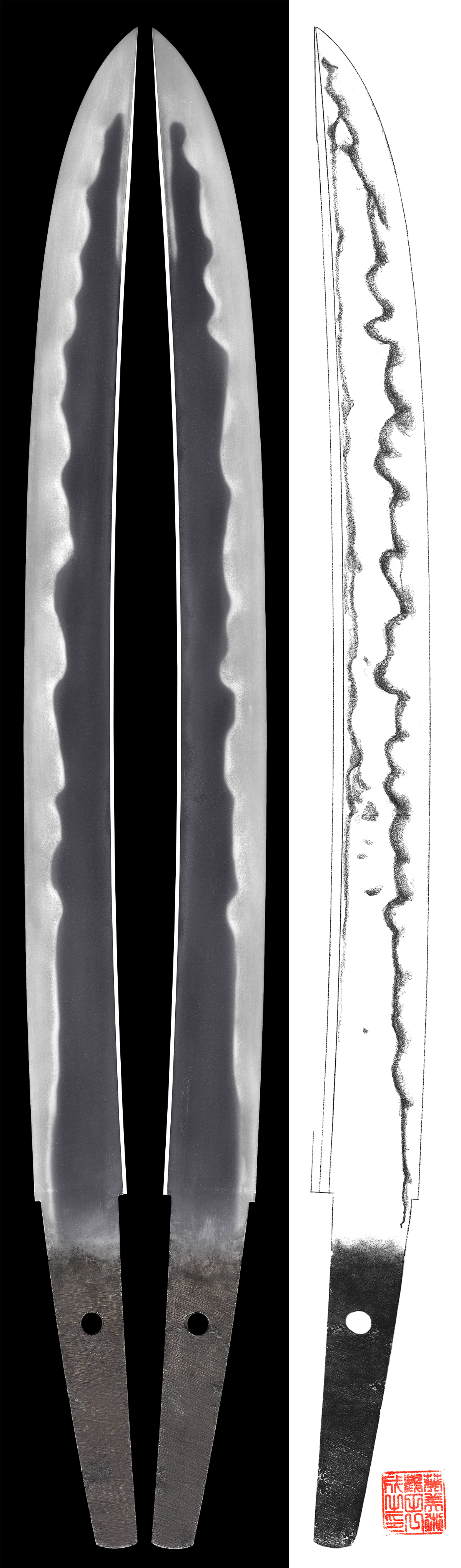 This blade is his typical Soshu style Oo gunome midare and doranba style hamon.