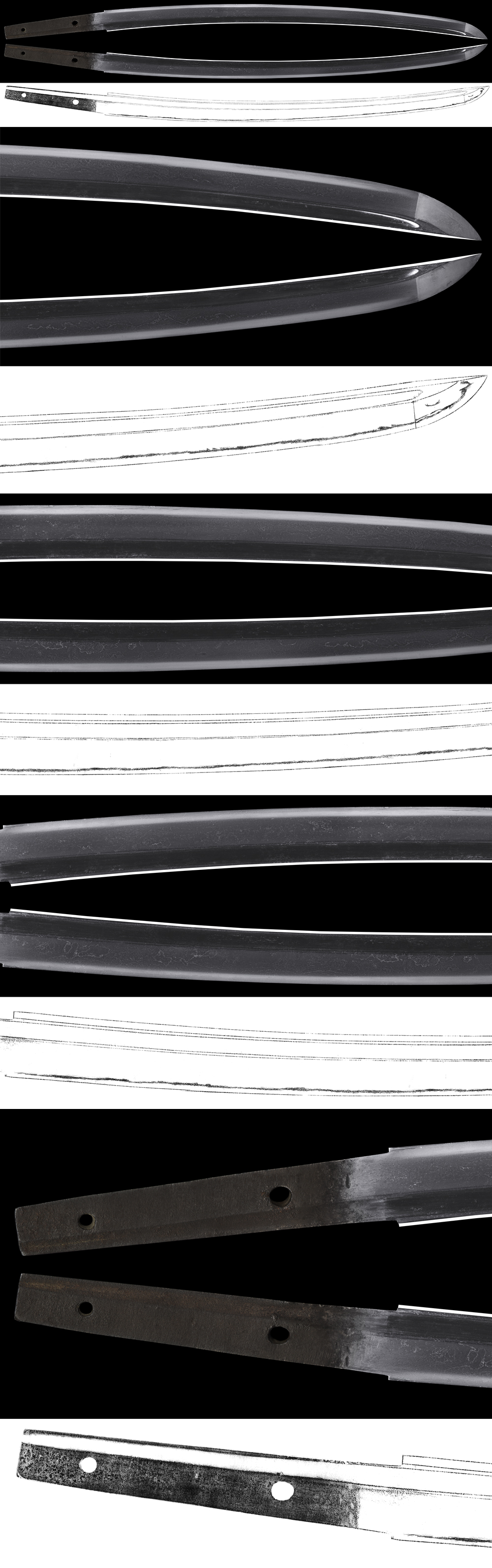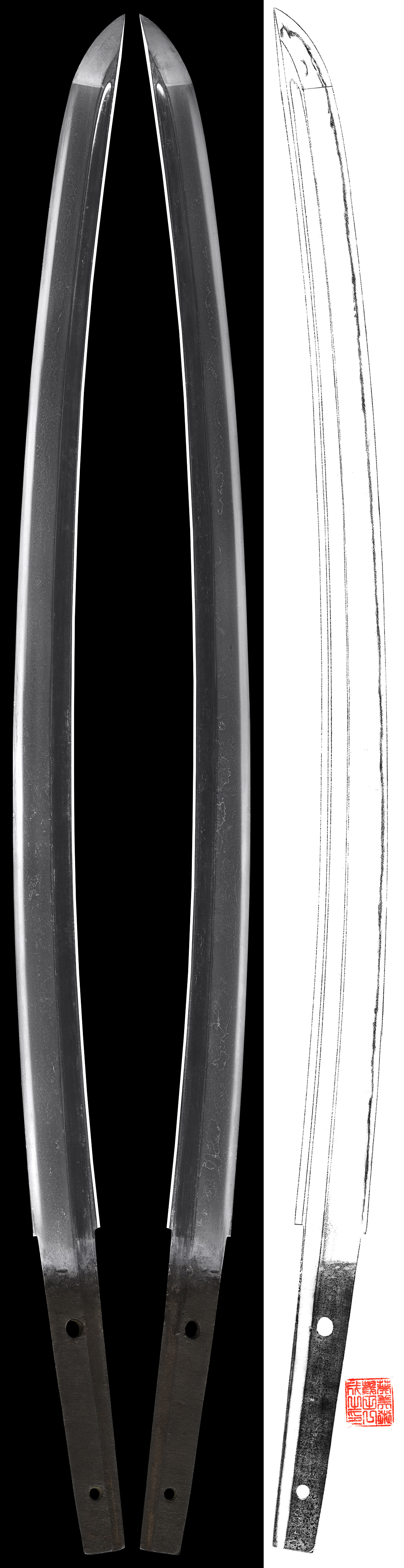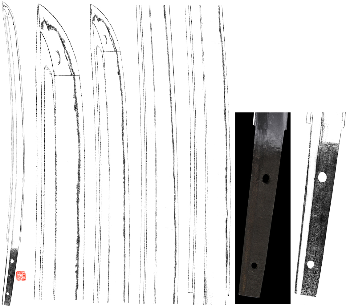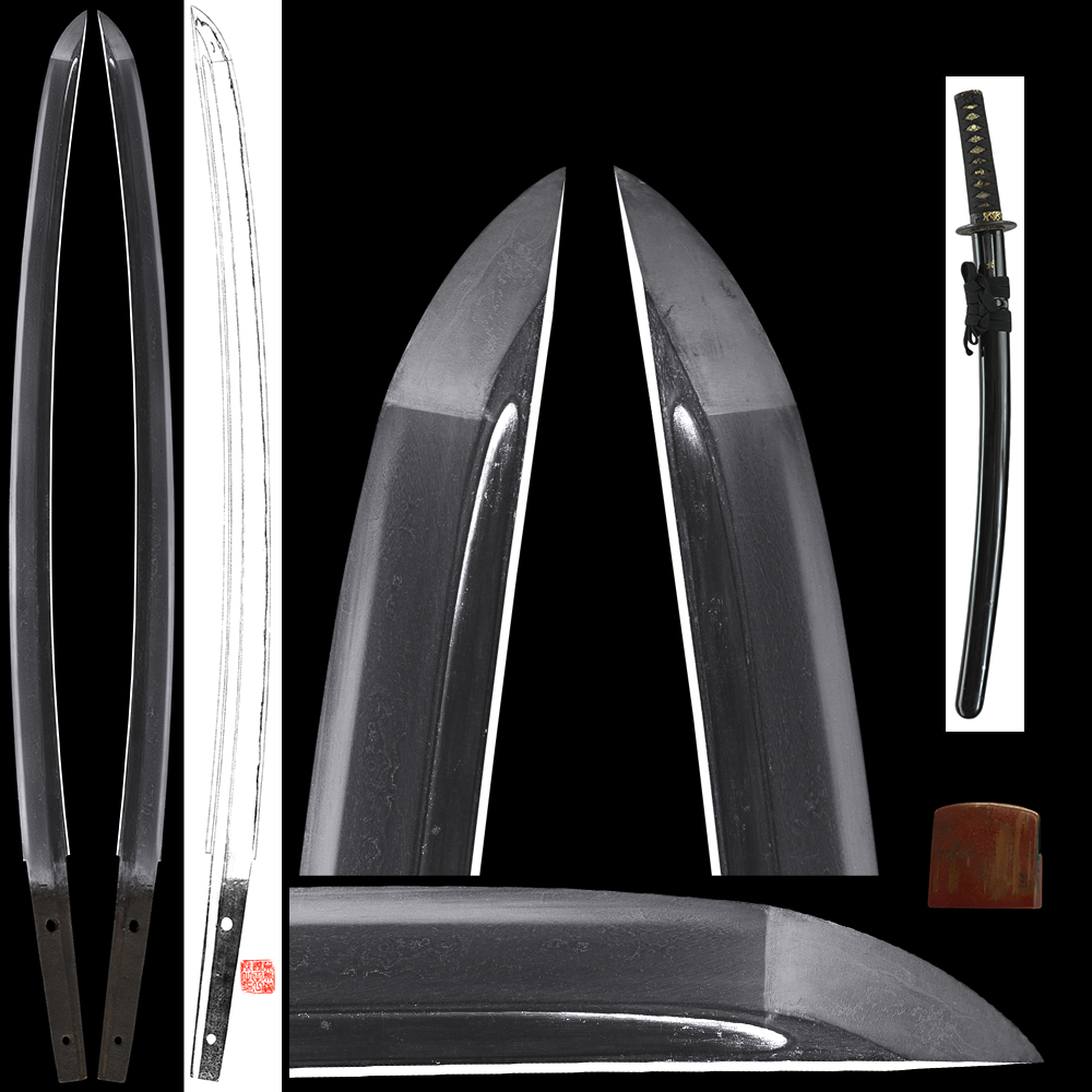 Shape : The blade is suriage mumei(cut shortened) with thick and longer and engraved bo-hi on both sides of the blade.