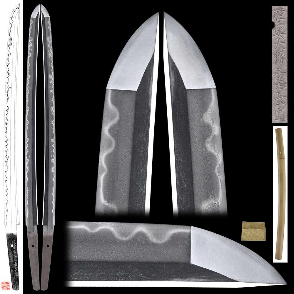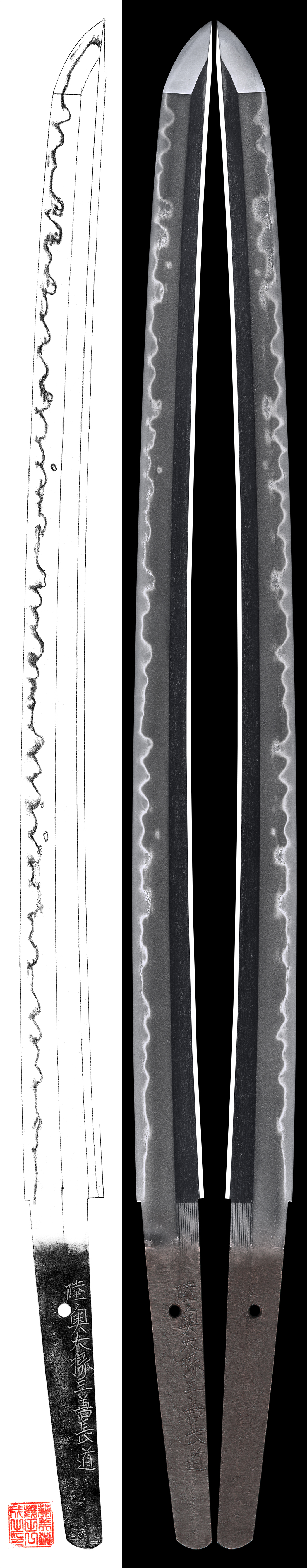 Special feature:Miyoshi Nagamichi, born Miyoshi Toshiro lived at Matsuyama in Iyo province is a grondson of Nagakuni. Nagakuni was a retained swordsmith of Kato Yoshiaki. Nagakuni and his son Masanaga, the father of Nagamichi went along with the Kato family when they moved to Aizu in O-shu province in 1627. Nagamichi was born in 1633 who was called Michinaga in his youth. Accepting Mutsu-Daijo in 1659, he changed the name to Nagamichi. Mr. Asaemon Yamada, known as a famous cutting tester ranked Nagamitsu Saijo-Owaza-mono in his book as one of twelve excellent swordsmiths at the point of sharpness. Quite a few swords forged by Nagamichi survive with the result of cutting test.