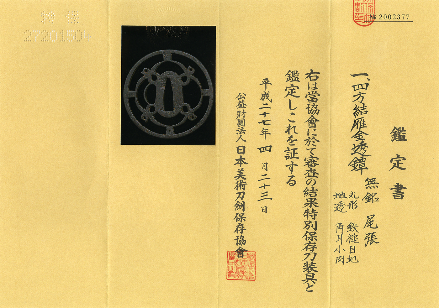 Tsuba :On the roud shape iron tsuba arigane(wild goose) design engraved in openwork.