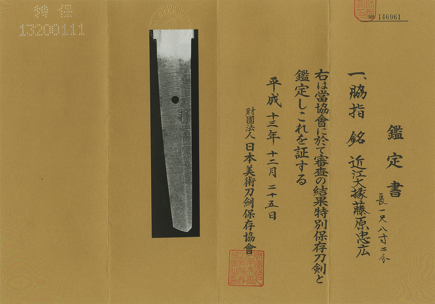 Tadahiro designated the Omi-Daijo in 1641, aged 29 and continued not only forging sword,