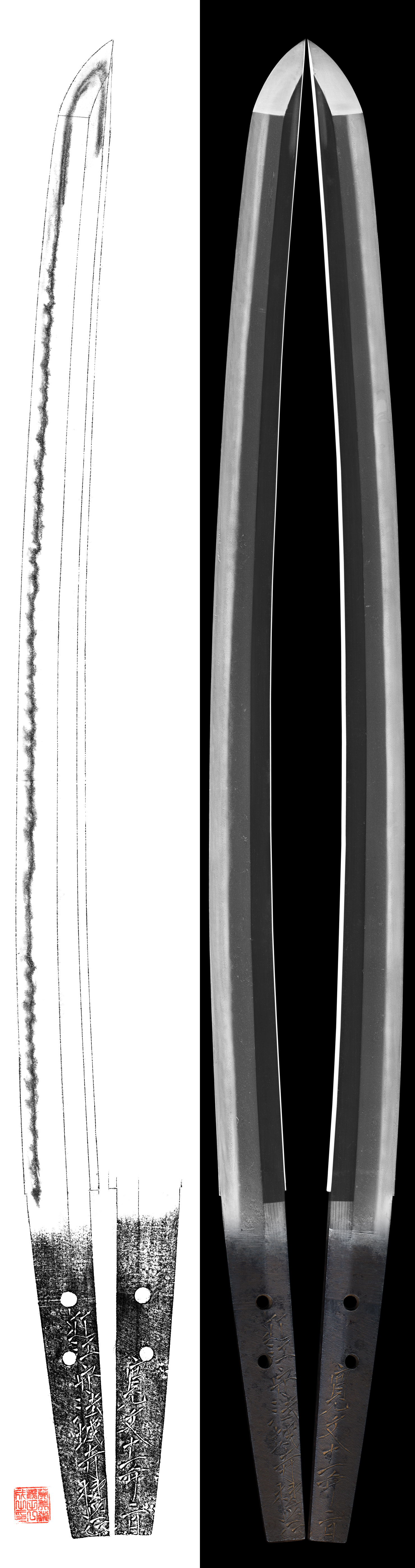 Shape : The blade is suriage about 3 cm wide and thick with small sori Kanbun shape.