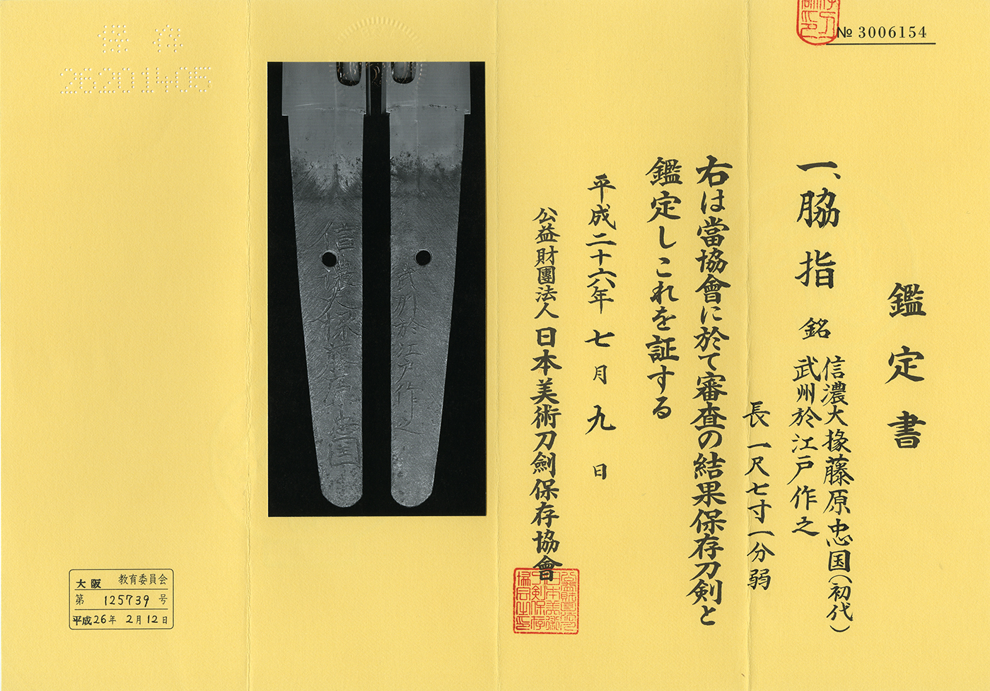 Signature : Shinano Daijo Fujiwara Tadakuni